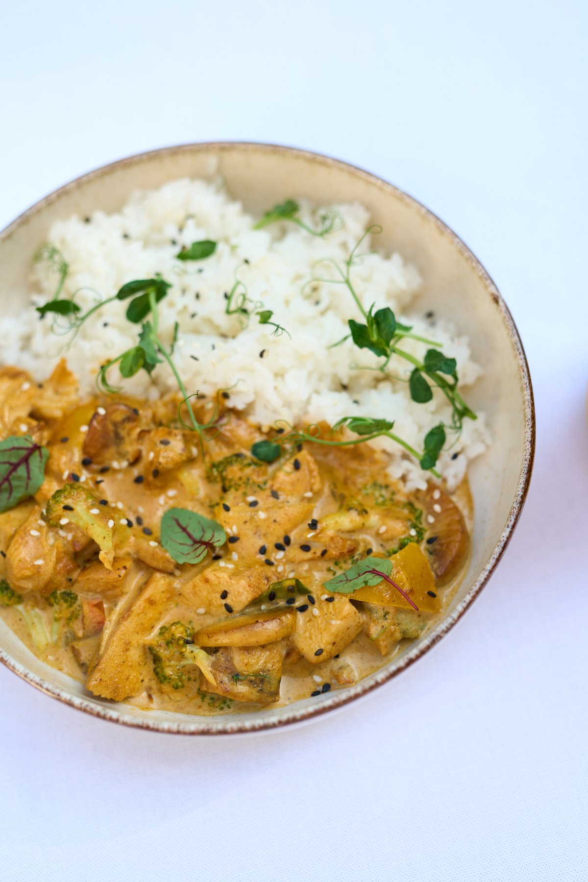 (куриное филе, паста карри, сливки, перец светофор, лук, брокколи, цветная капуста, шампиньоны)
