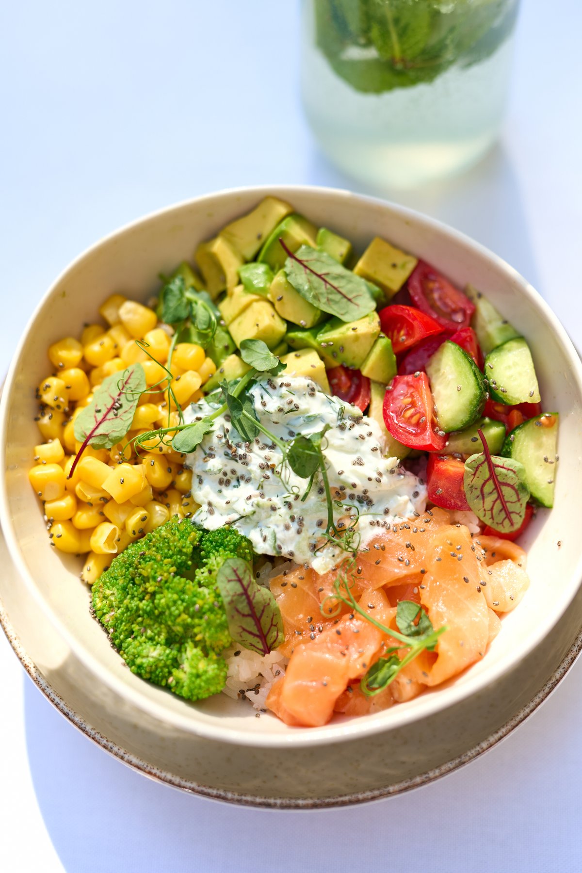 (лосось малосольный, свежие огурцы и помидоры, авокадо, кукуруза, соус дзадзики, брокколи, рис, соевый соус, чиа)
