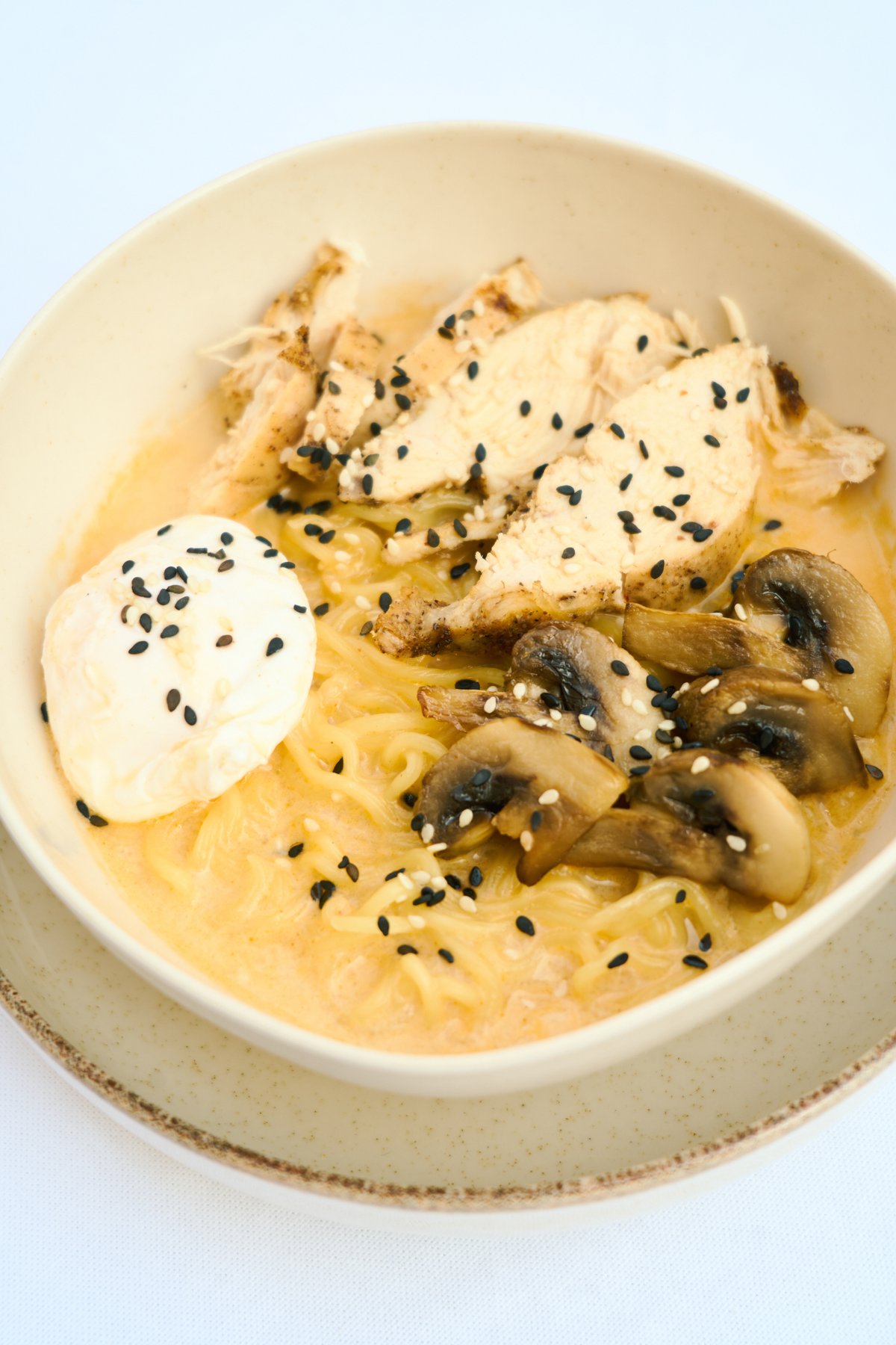 (лапша, курица, сыр творожный, чеддер, яйцо, шампиньоны, листья нори)