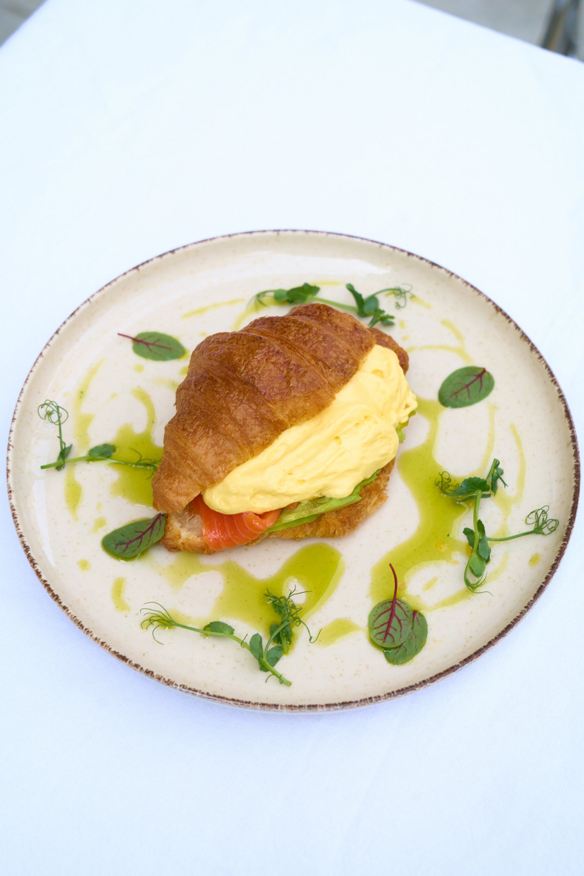 (круассан, авокадо, лосось, яйцо, соус голландез)