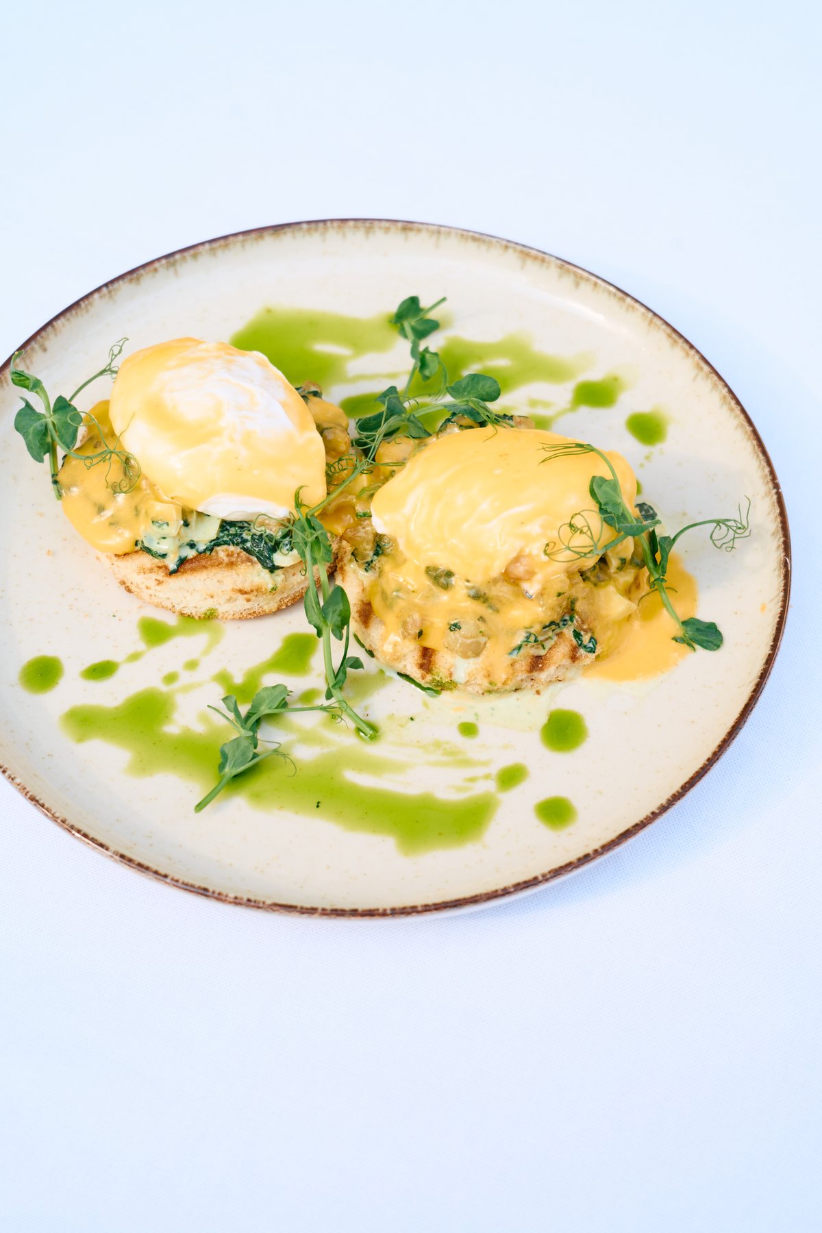 (яйца, булочка бриошь, гарнир со шпинатом и креветками, соус голландез)