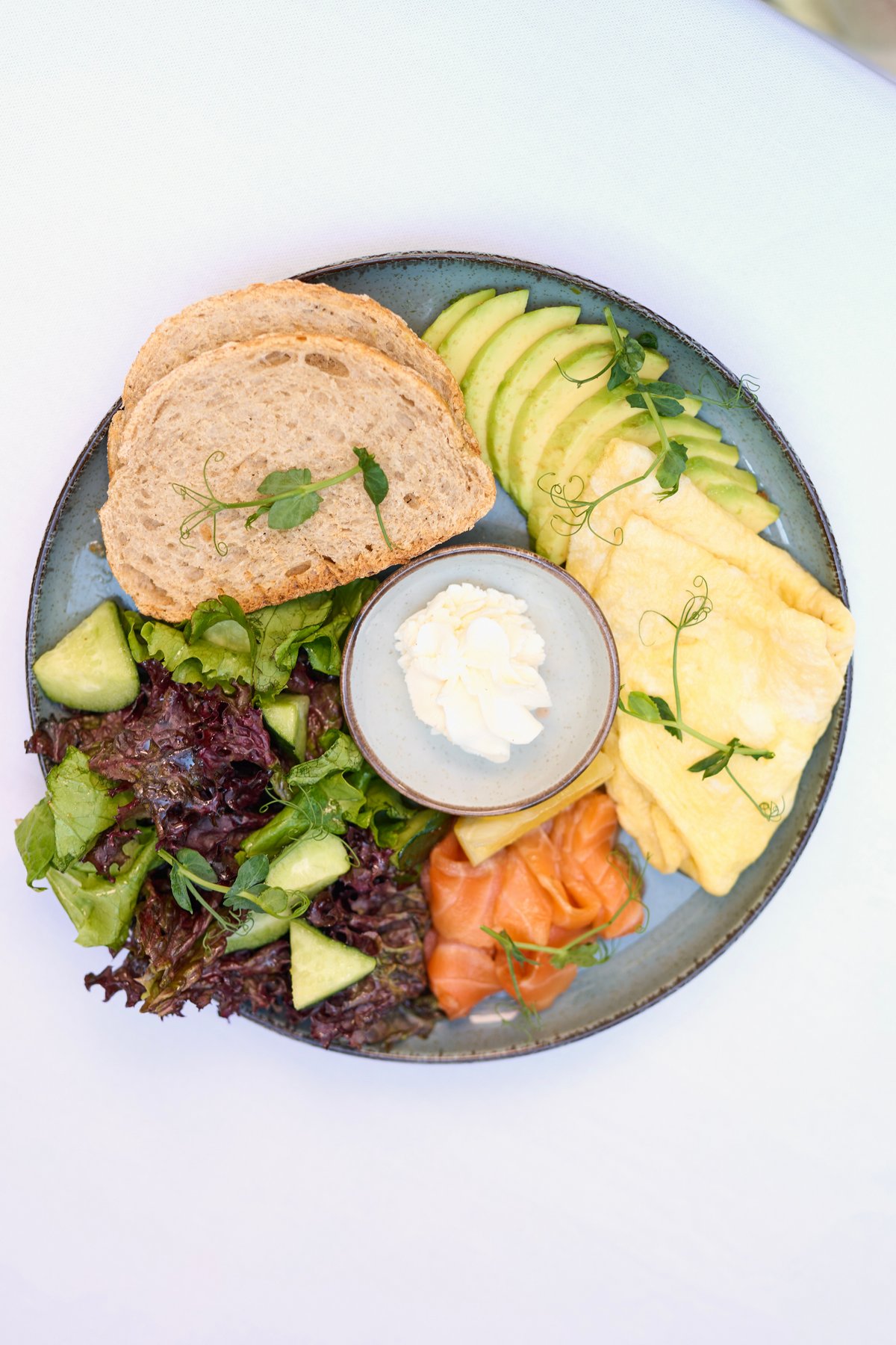 (яйца, лосось малосольный, авокадо, хлеб, творожный сыр, огурец, микс салата, лимон)