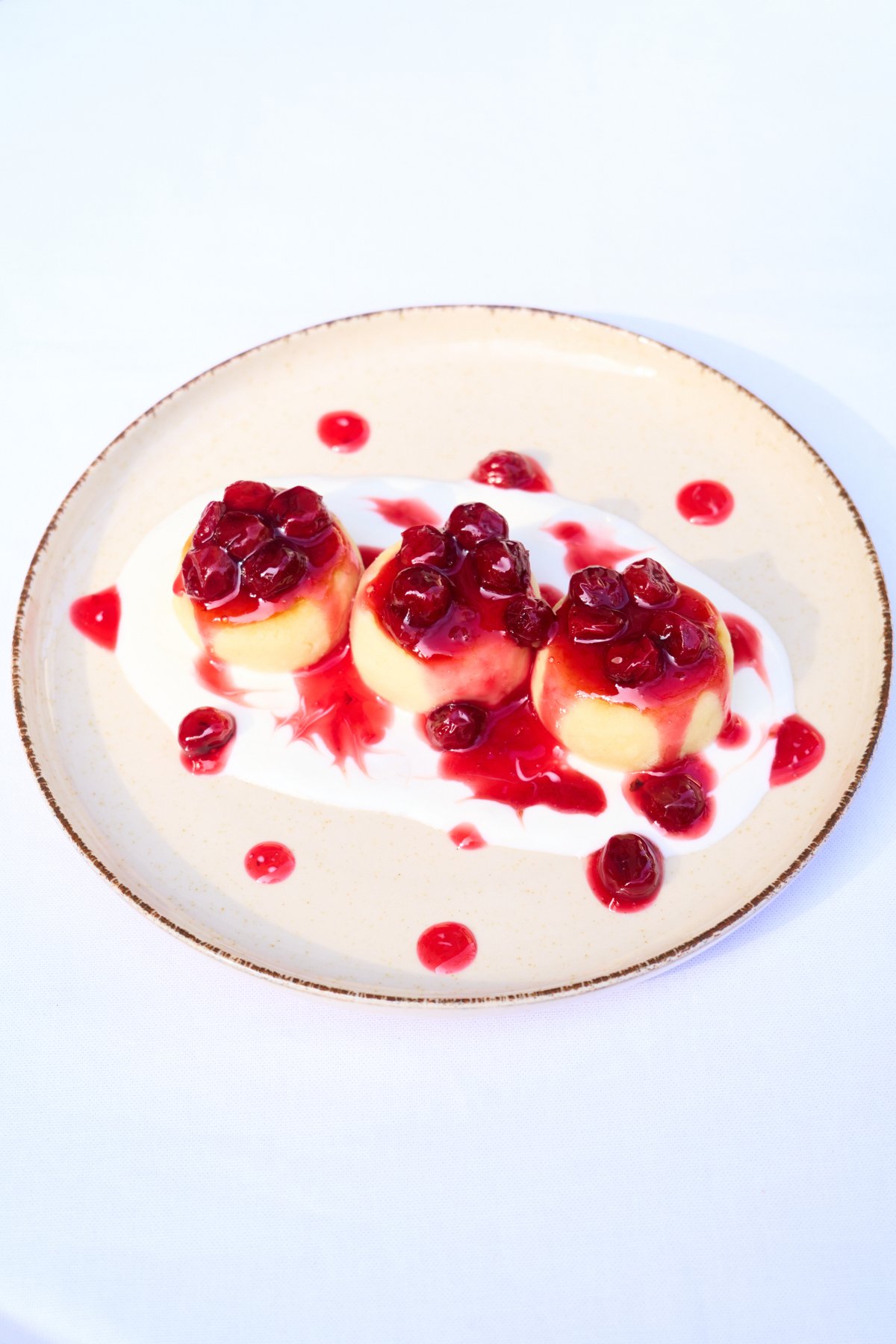 (сырники творожные, йогурт греческий, соус вишнёвый/ананасовый)