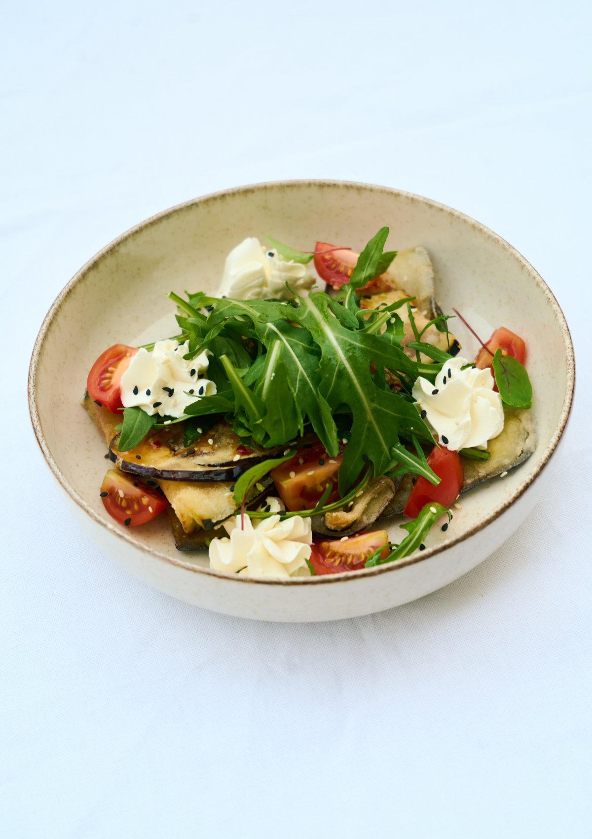 (сыр творожный, баклажаны, черри, руккола, соус свит чили)