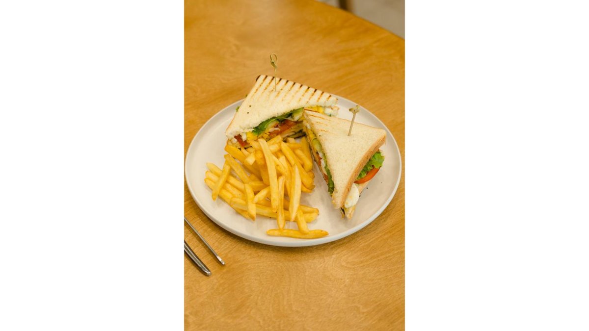 Белый хлеб, курица, яйца, крем чиз, листья салата, огурцы, помидор, соус тар-тар, картофель-фри
