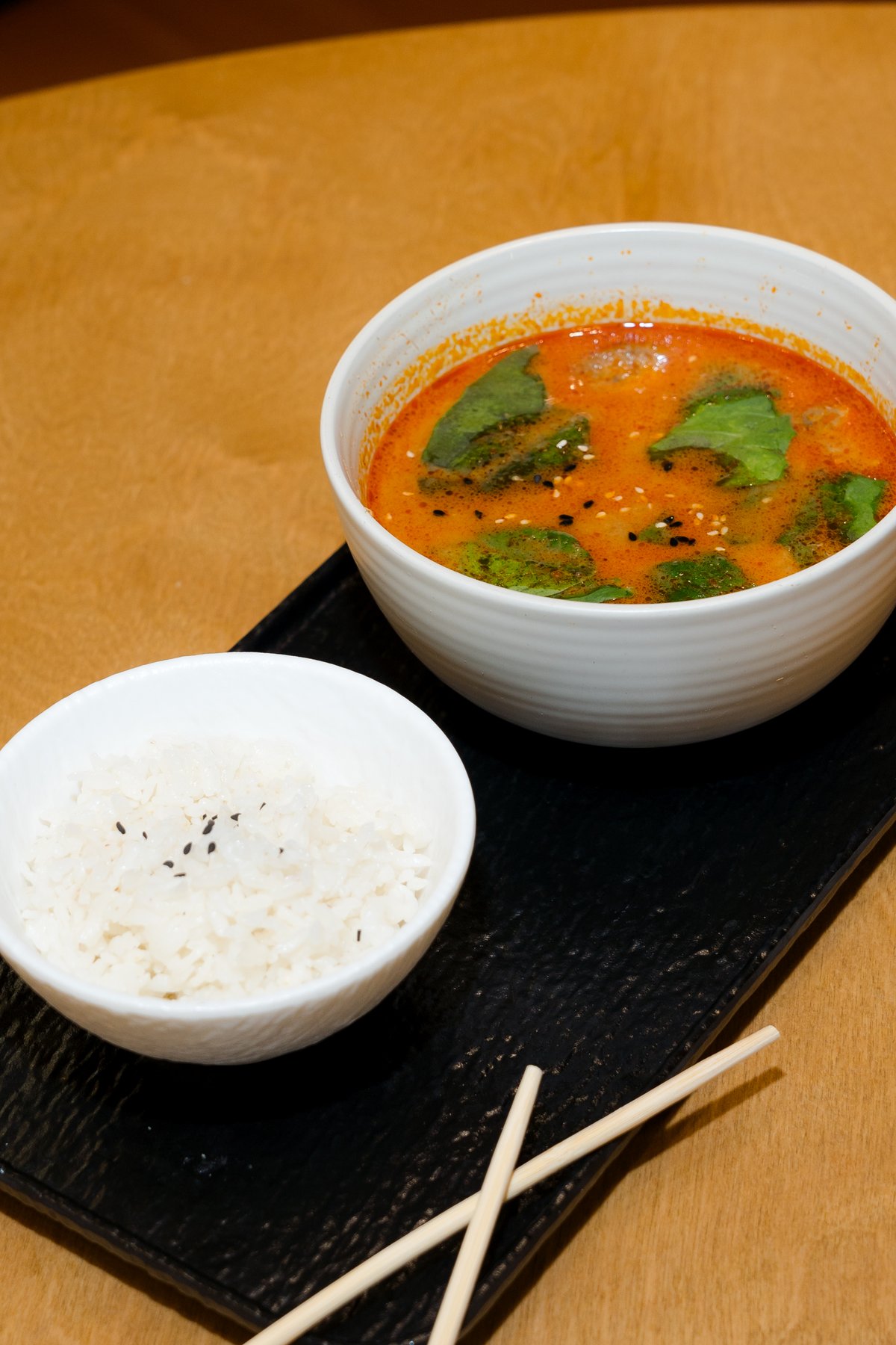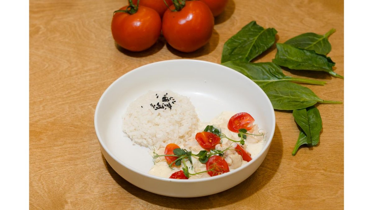 Лосось, креветки, лук, чеснок, шампиньоны, кокосовое молоко, соус “том-ям”, рис