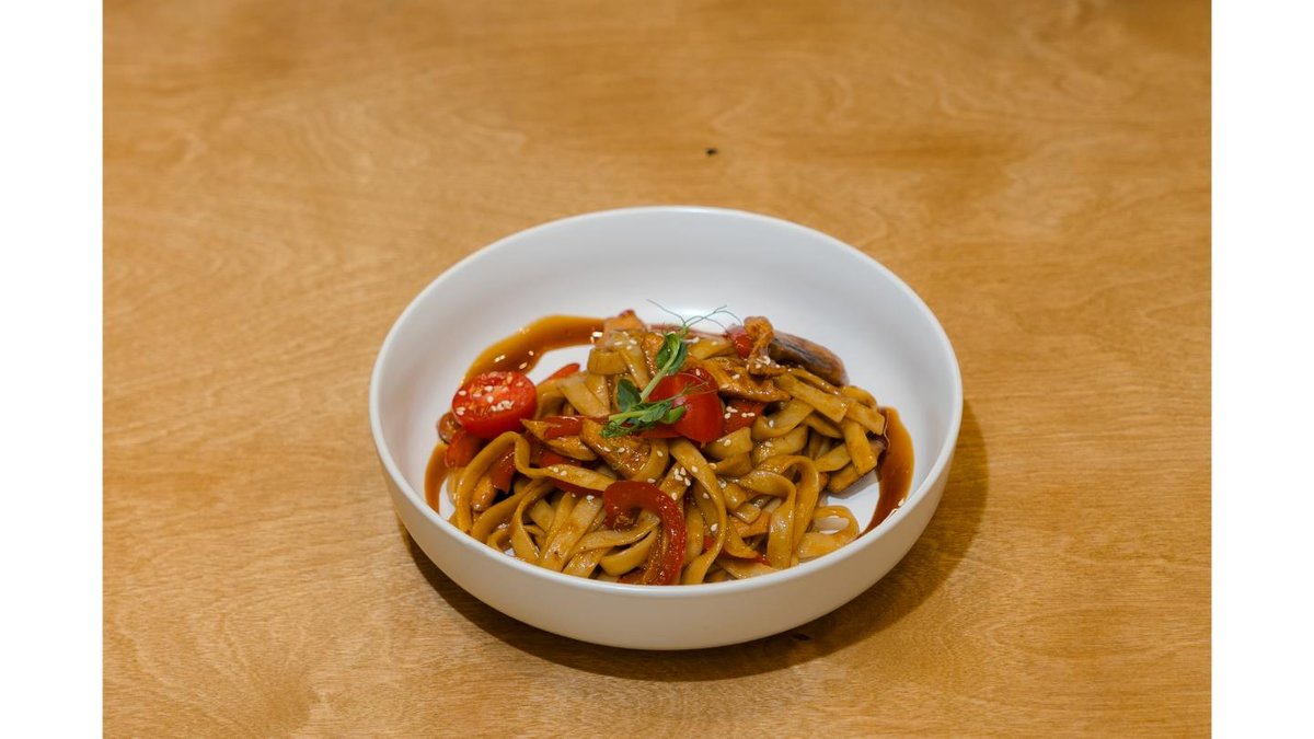 Филе, болгарский перец, шампиньоны, лапша, зелень, черри, кунжут