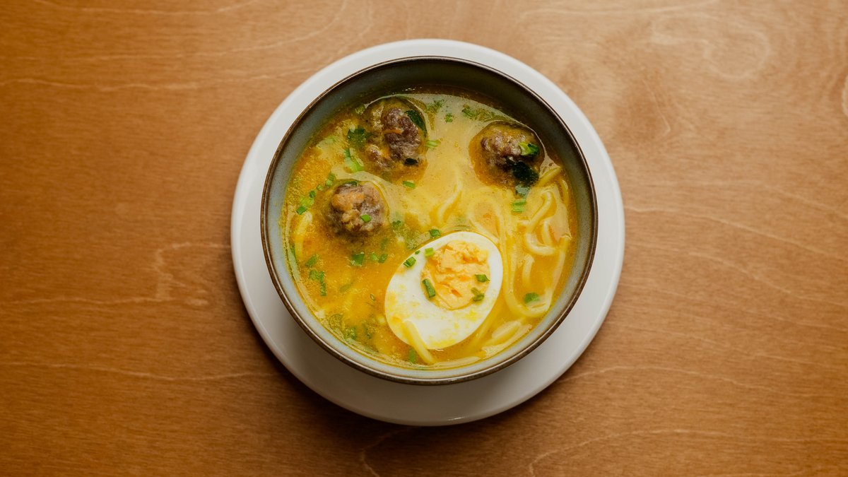 Говяжьи фрикадельки с обжаренным луком и мягким яйцом подаются вместе с яичной лапшой и свежим зелёным луком. Сытное, тёплое и по-настоящему вкусное блюдо, которое согревает
