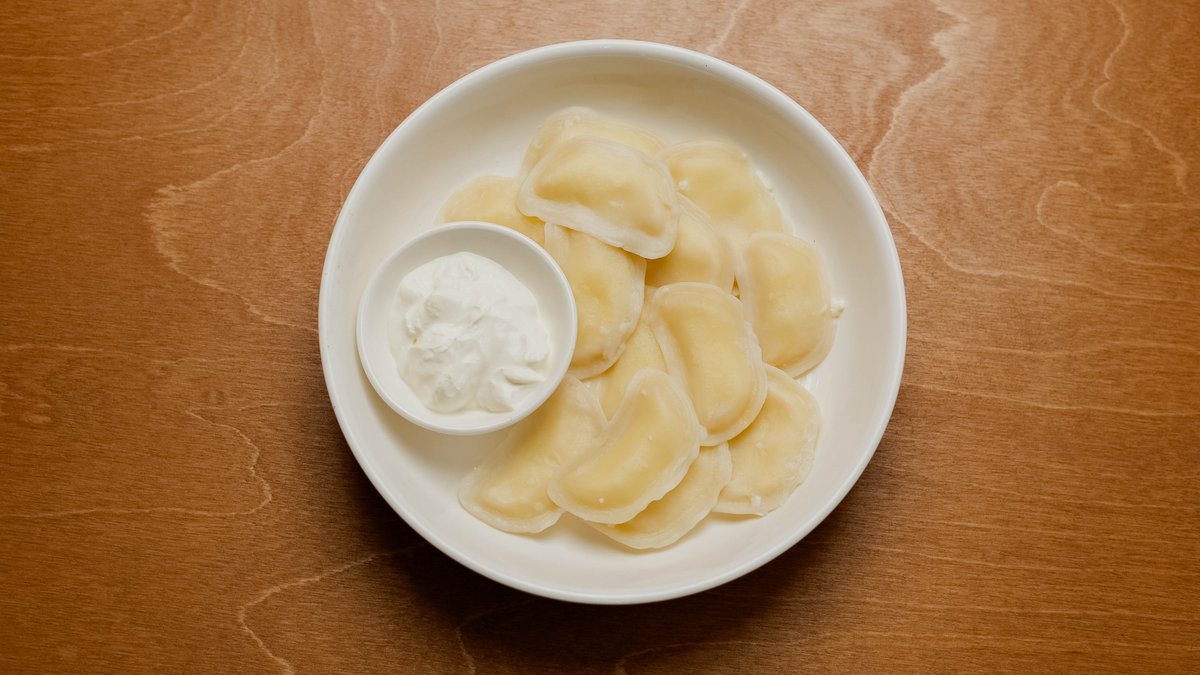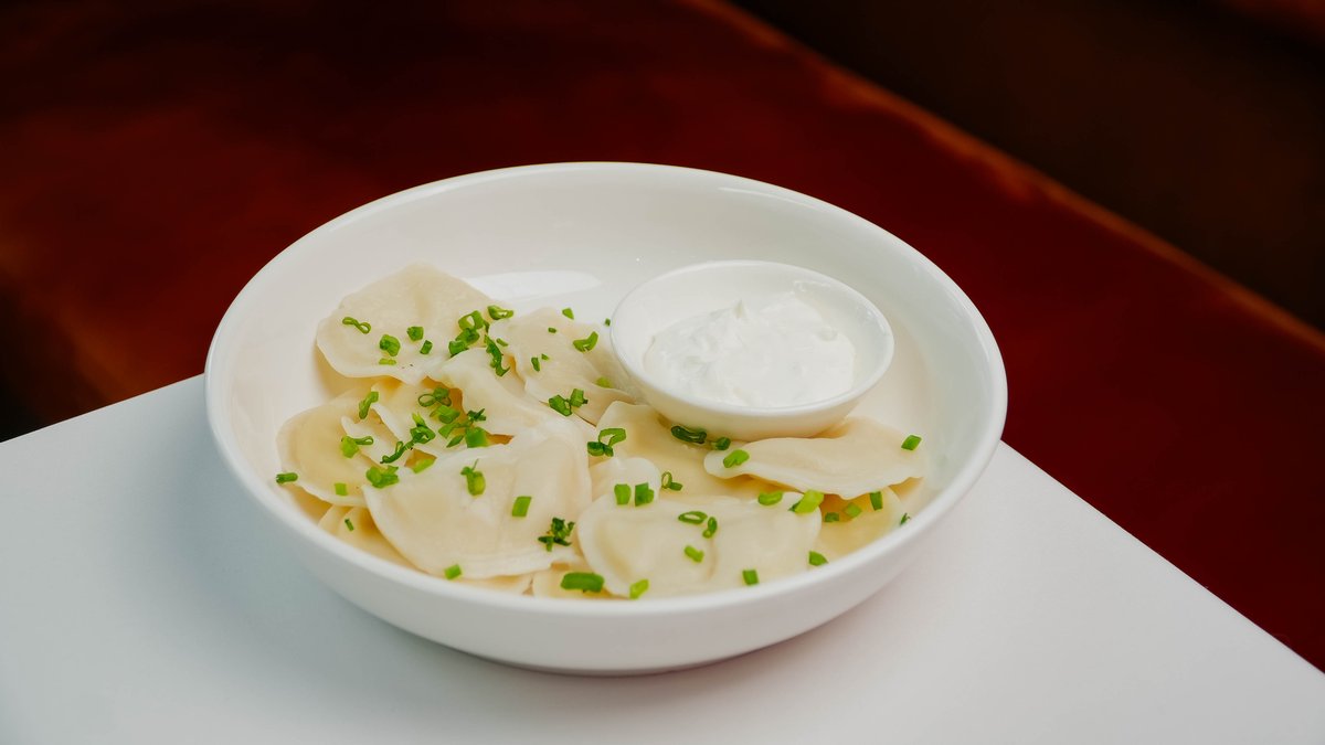Нежные вареники из тонкого теста с мягкой картофельной начинкой. Подаются горячими, со сметаной и свежим зелёным луко