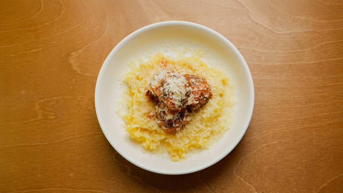 Сочные говяжьи фрикадельки подаются с нежным сливочным картофельным пюре, сыром пармезан и густым томатным соусом
