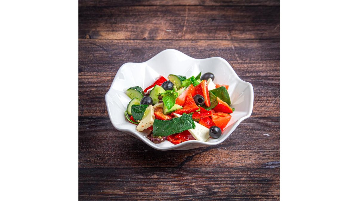 Огурцы, брынза, лист салата, сухой базилик, маслины, оливки, оливковое масло