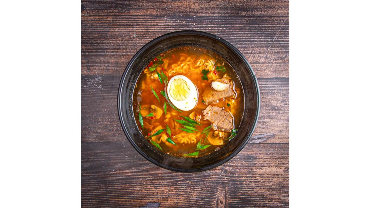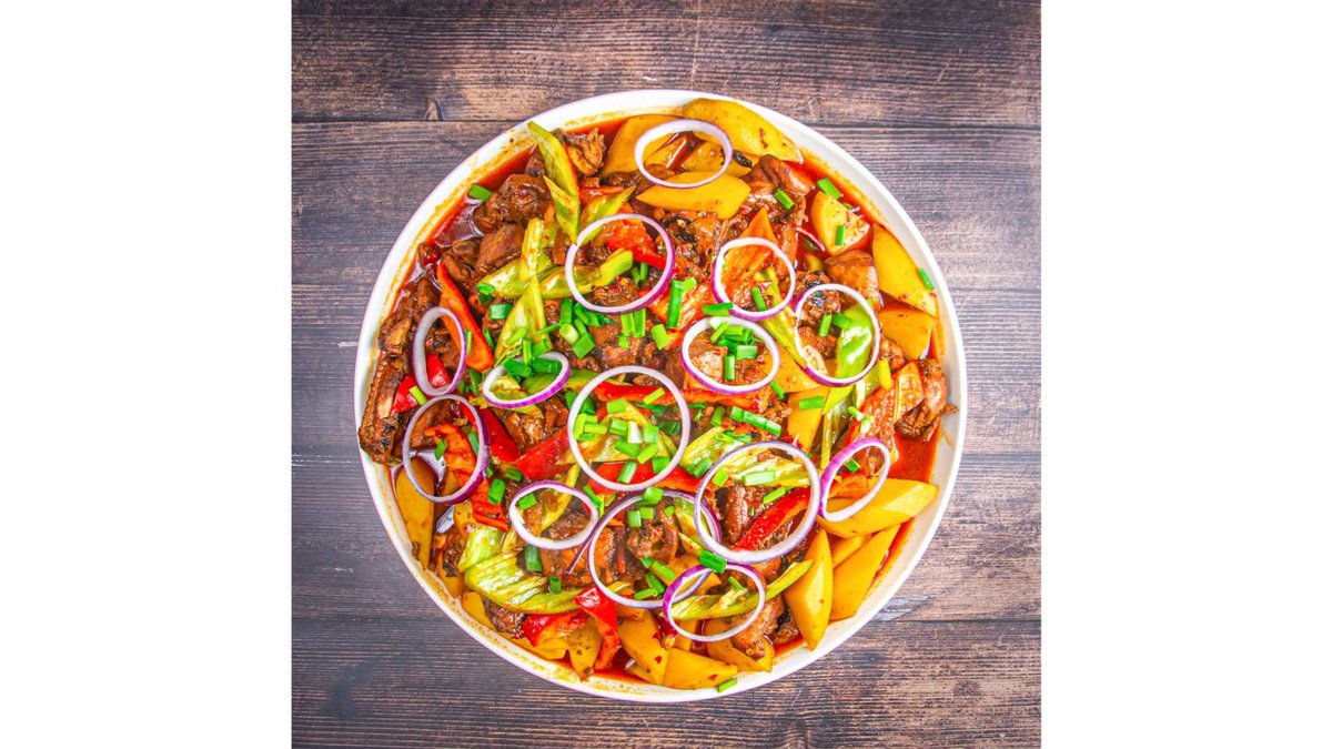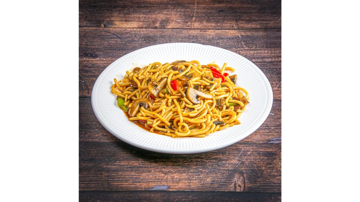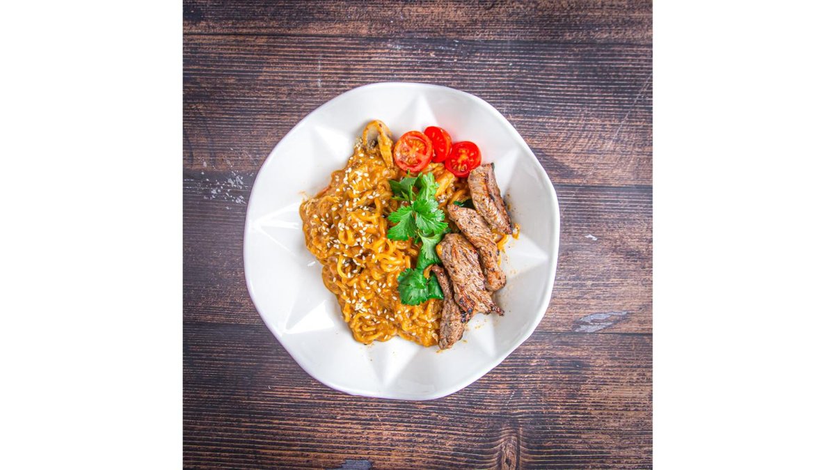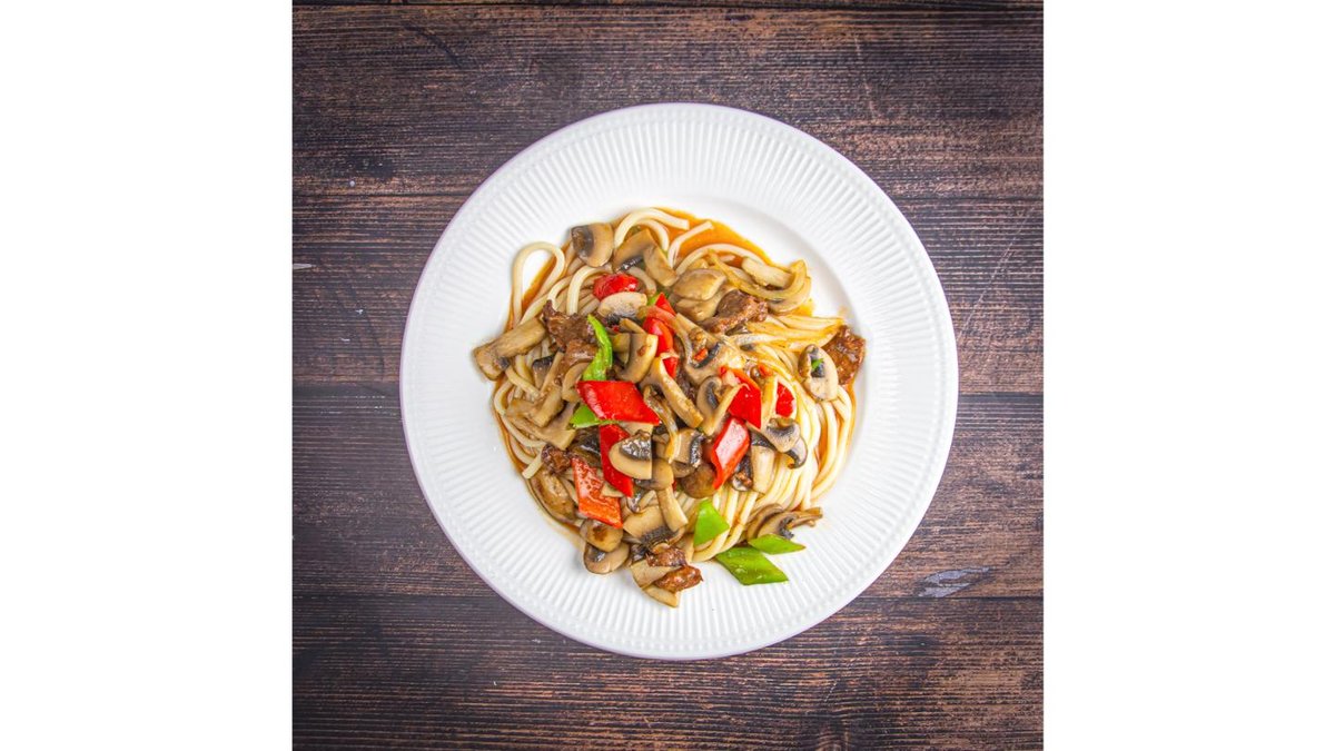Жареный лагман, Говяжье мясо, шампиньоны, овощи, тесто, специи, томат