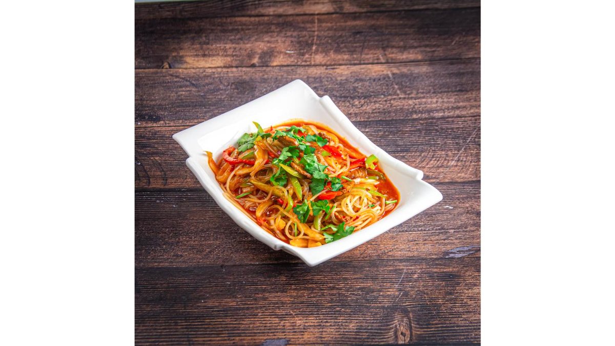 Говяжье мясо, фунчоза, лук, перец красный и зеленый, капуста басай, специи
