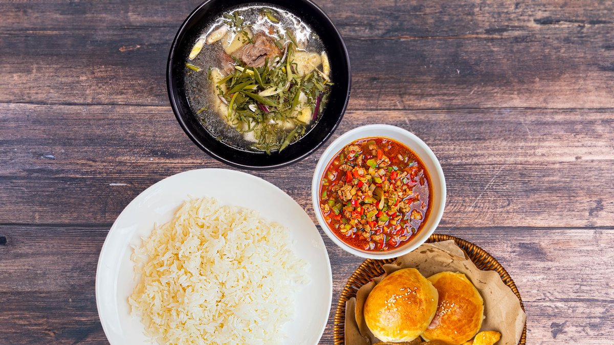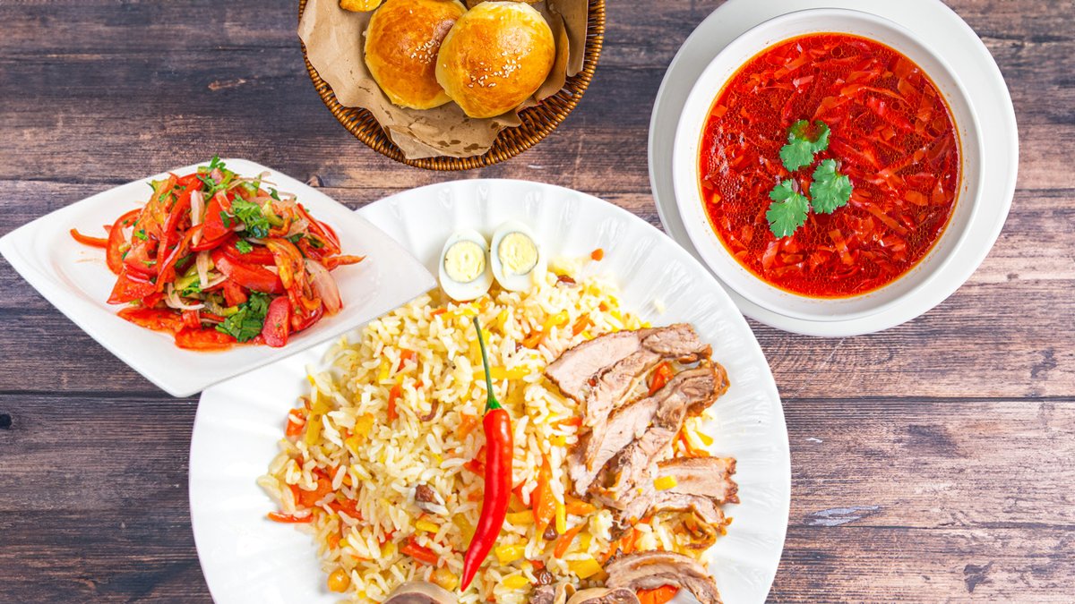 Плов говяжий, Борщ, салат Ачикчучук, лепешка