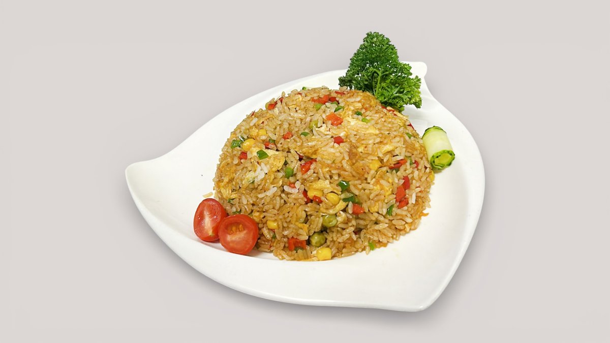 Жареный рис с красным и зеленым перцем, кукурузой и яйцом