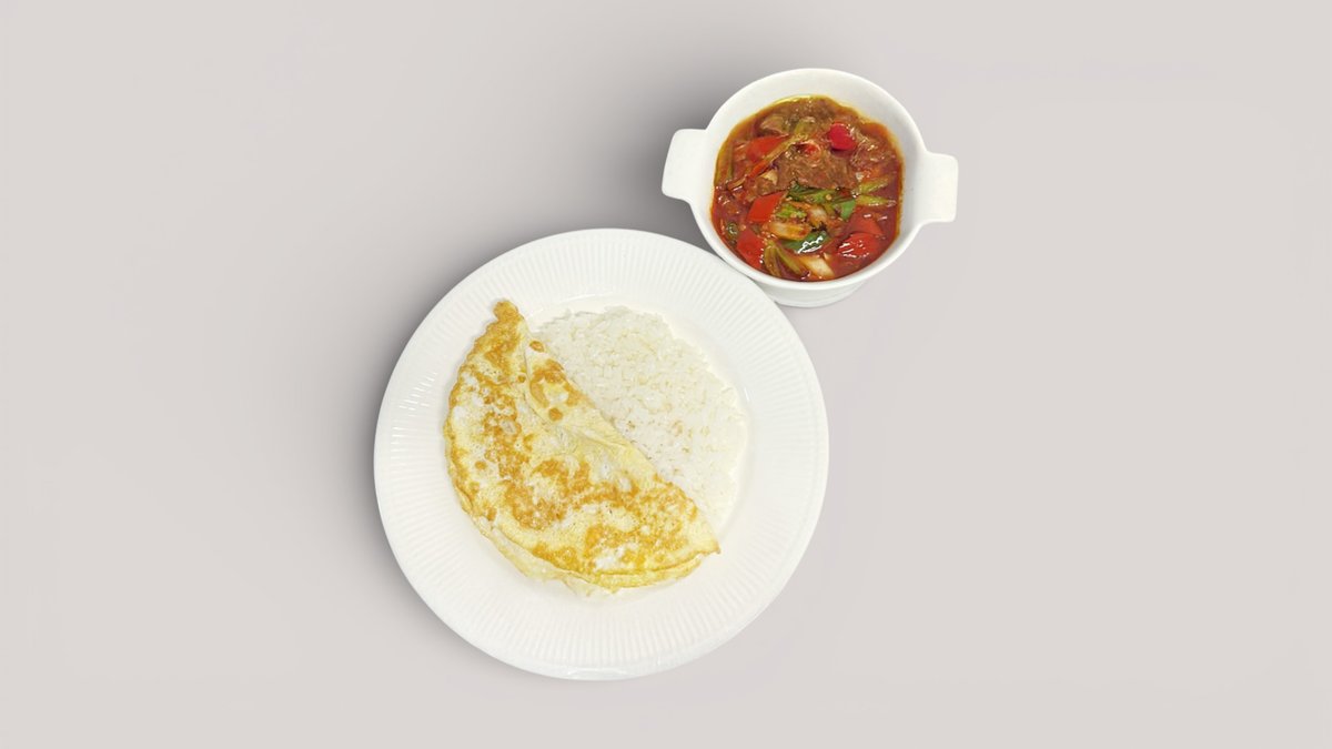 крупно нарезанное говядины,перец красный,перец зеленый,сельдерей,пекинская капуста,рис,омлет