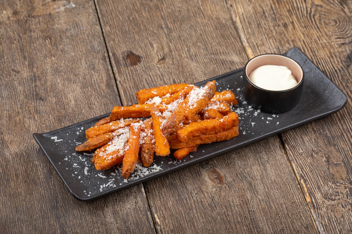 Батат фри с соусом блю чиз и пармезаном