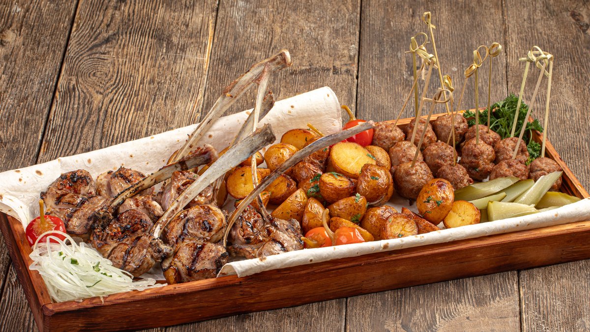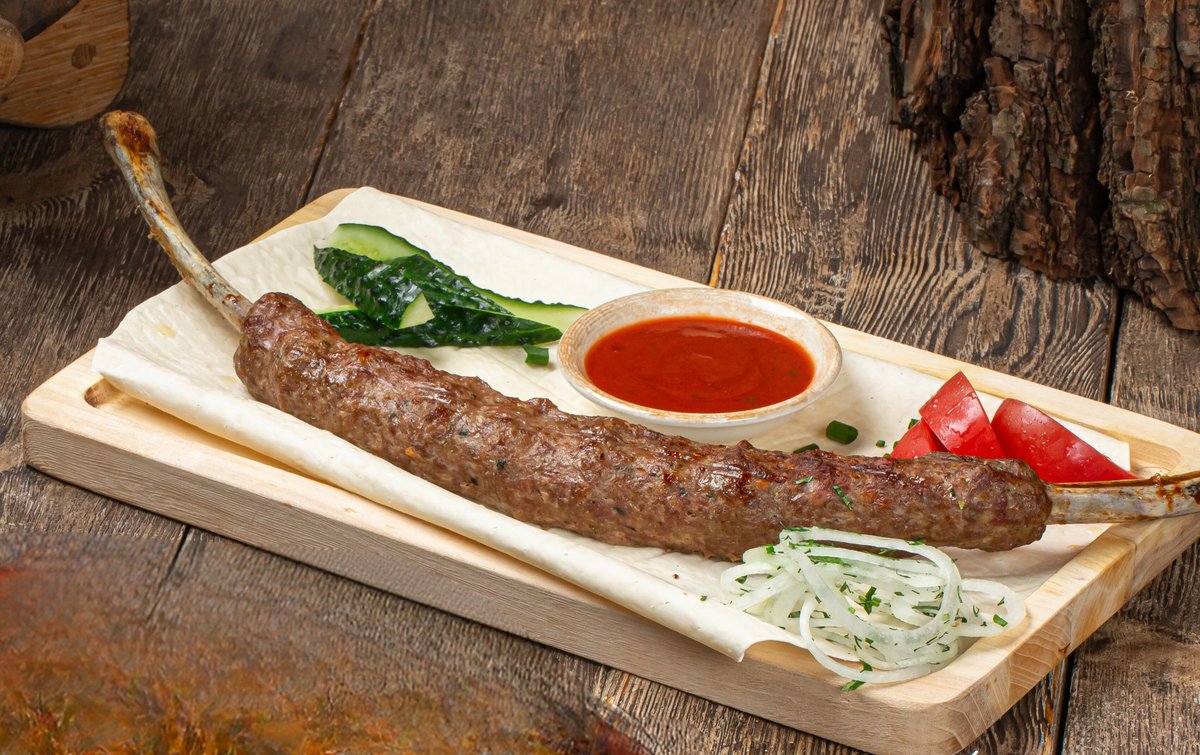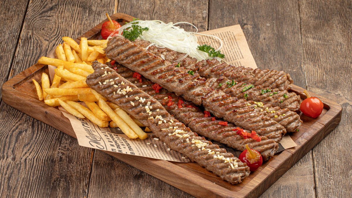 3 ЛИТРА ПИВА В ПОДАРОК Люля из баранины : -Классический -С маринованным красным перцем -С сыром чечил -С перцем халапеньо -С зирой по- Ташкентски -с фисташками Подается с белым луком , картофелем фри и маринованным красным перцем