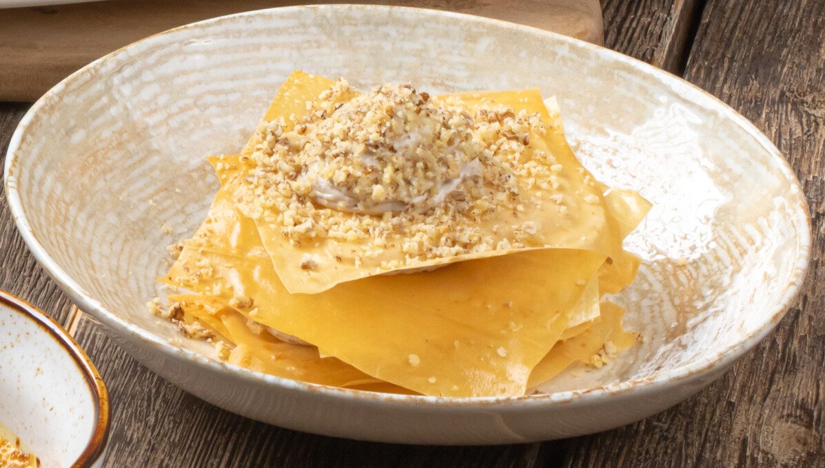 Салат с хрустящими баклажанами и чечилом в сливках