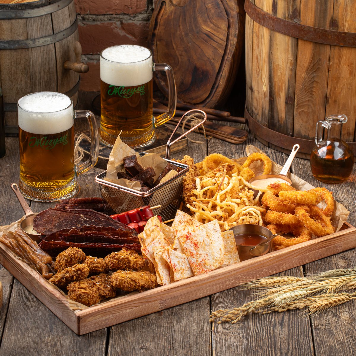 Чечил жареный, вяленые мясные палочки, вяленые куриные палочки, мясные чипсы, кольца кальмаров, луковые кольца, гарлики, куриные крылья, охотничьи колбаски, пшеничные чипсы