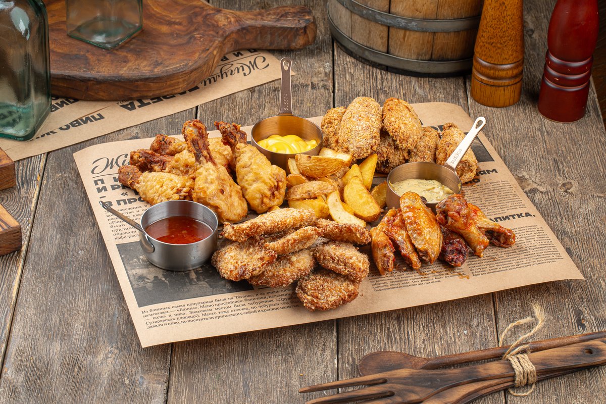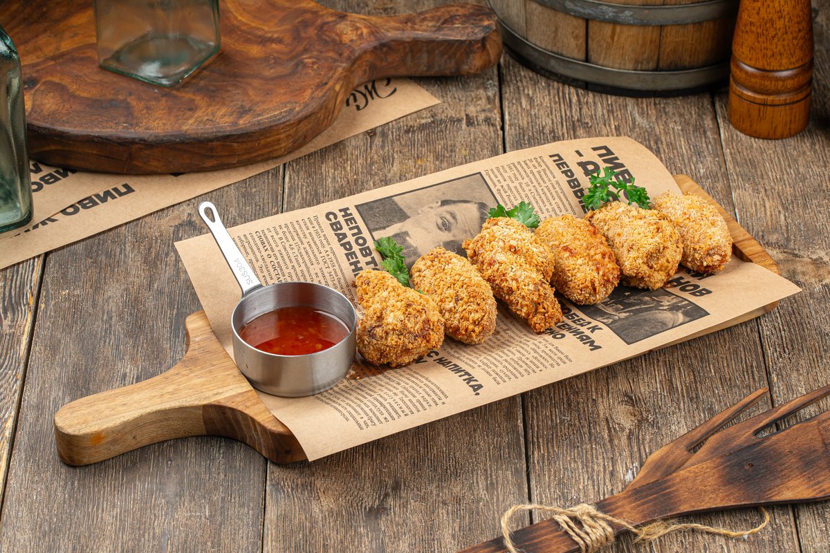 Куриные стрипсы, острые куриные крылышке в панировке, острые крылышки Баффало, острые куриные ножки, подаютс с соусами- сырный, свит чили, шанталь