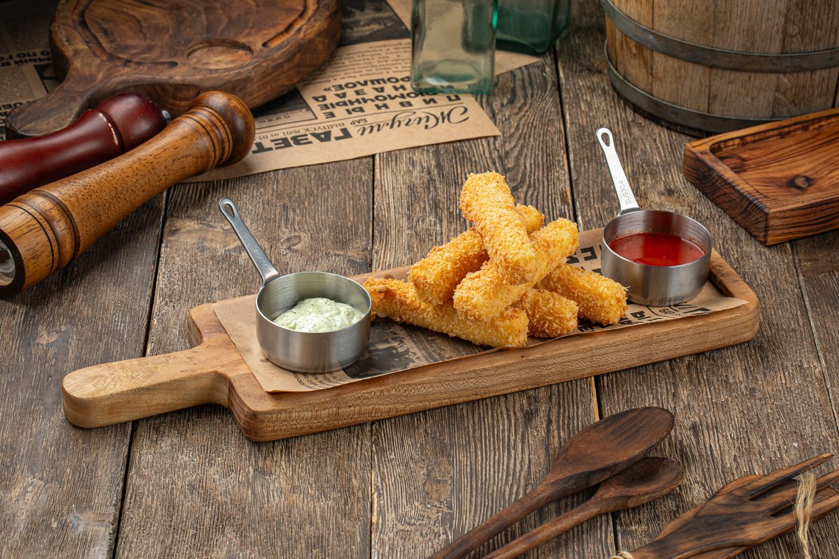 Палочки из сыра Гауда, в хрустящей панировке, чечил копченый стандарт, чечил копченый жареный
