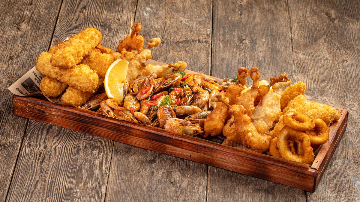 -3 ЛИТРА ПИВА В ПОДАРОК -Наггетсы из крабовых палочек с сыром -Наггетсы из краба -Кольца кальмара -Гренландские креветки с чили перцем -Тигровые креветки с ананасом в темпуре