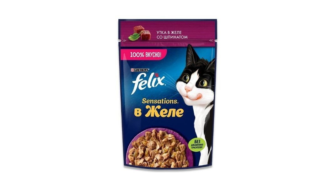Корм влажный Felix Sensations с уткой в желе со шпинатом для кошек 75 г