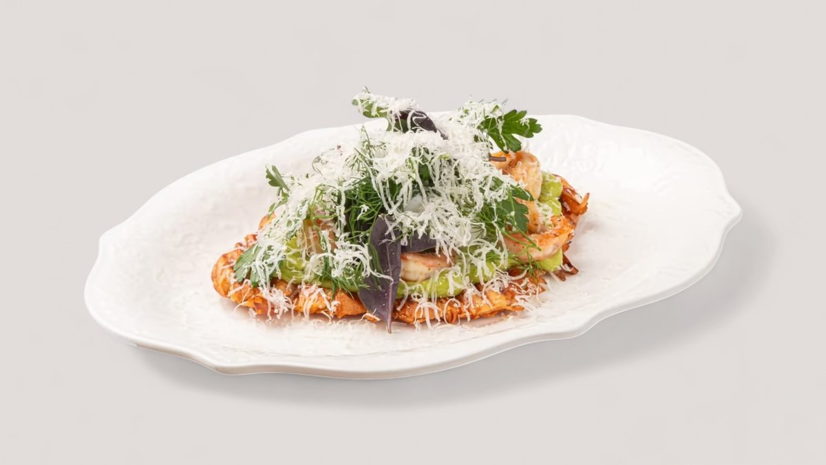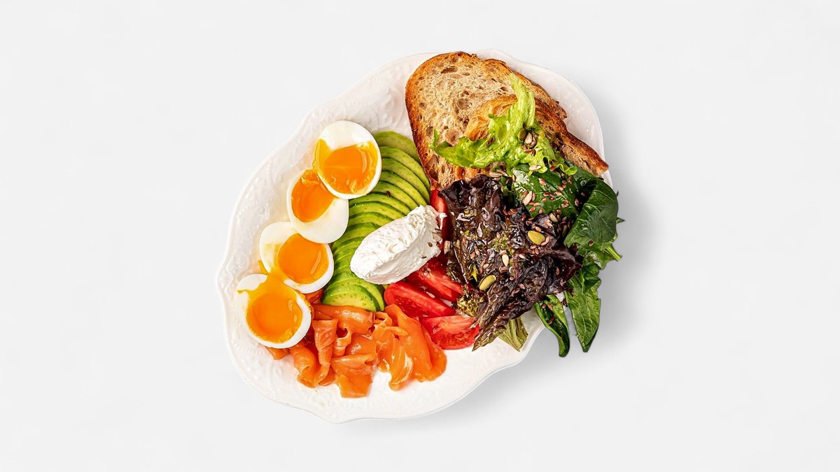 круассан классик, креветки, гуакомоле соус, яйцо куриное пашот