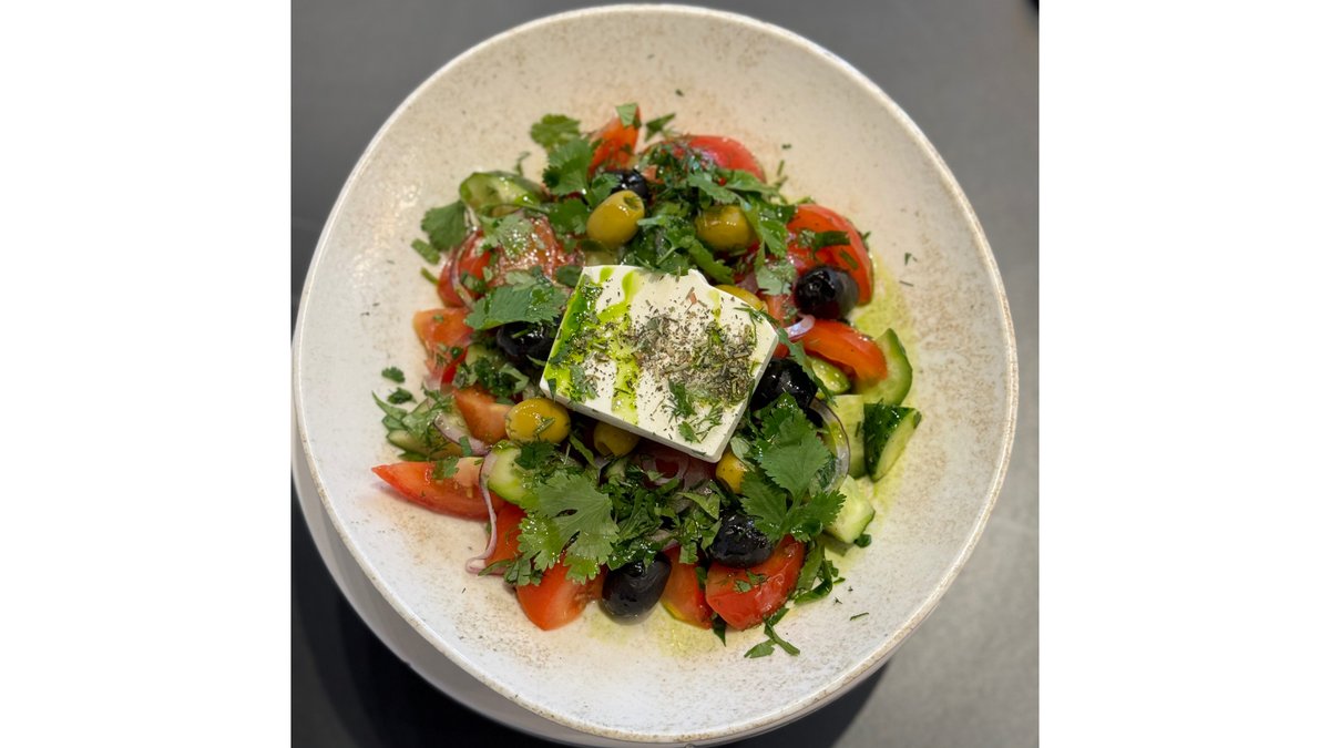 Огурцы, помидоры, сыр фета, оливки, маслины, соус винегрет