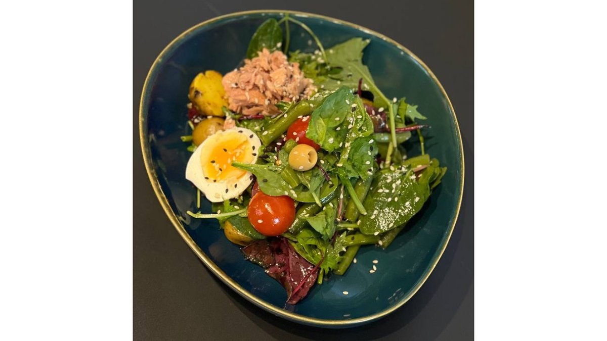 Микс листьев, тунец, бейби картофель, яйца, черри, стручковая фасоль, соус нисуаз