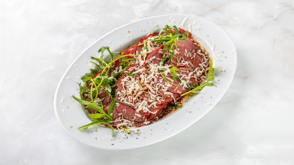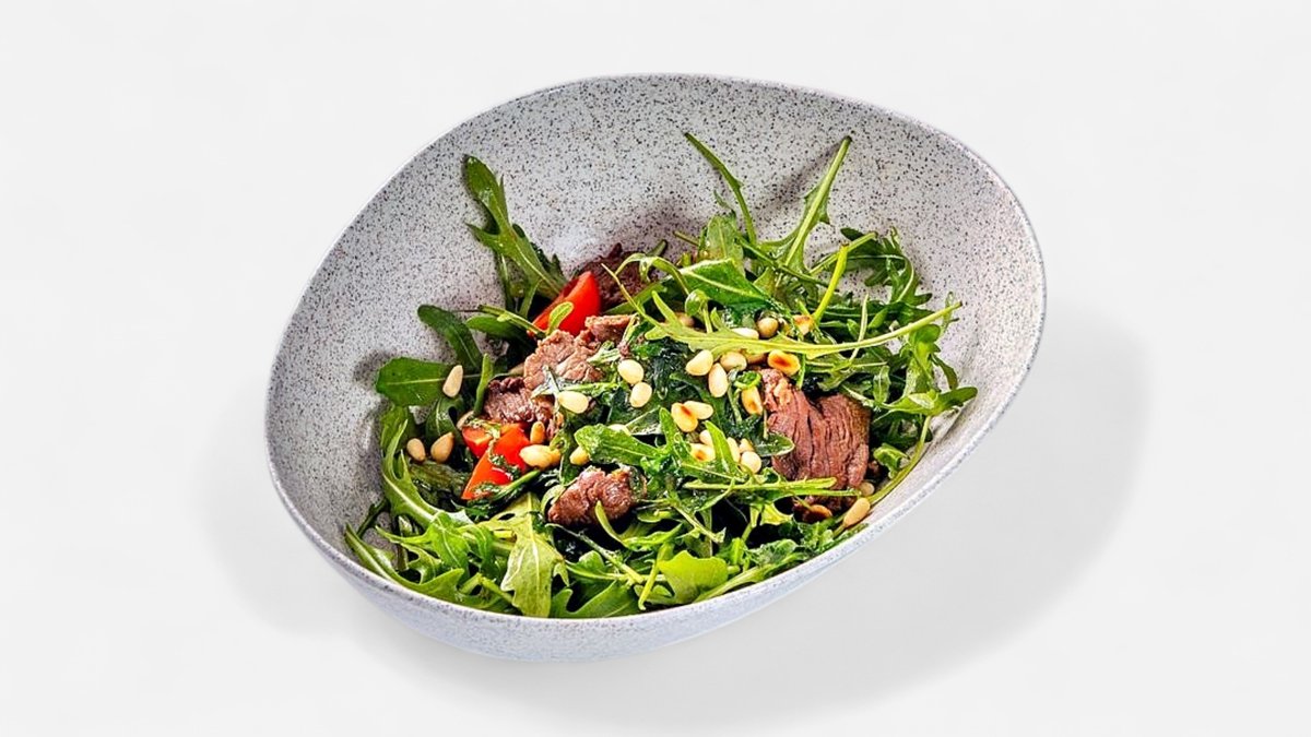 копченое мясо, руккола и пармезан, заправленные оливковым маслом, бальзамическим уксусом, с добавлением сумаха и орегано