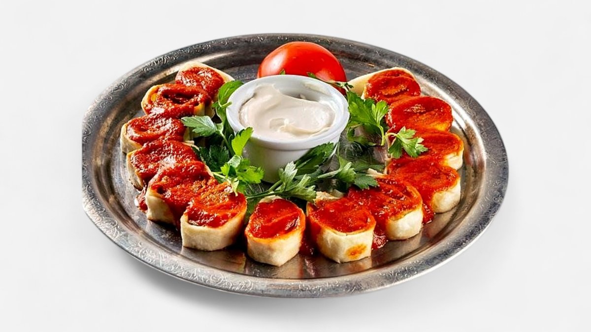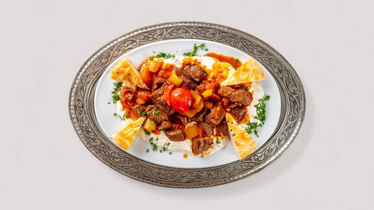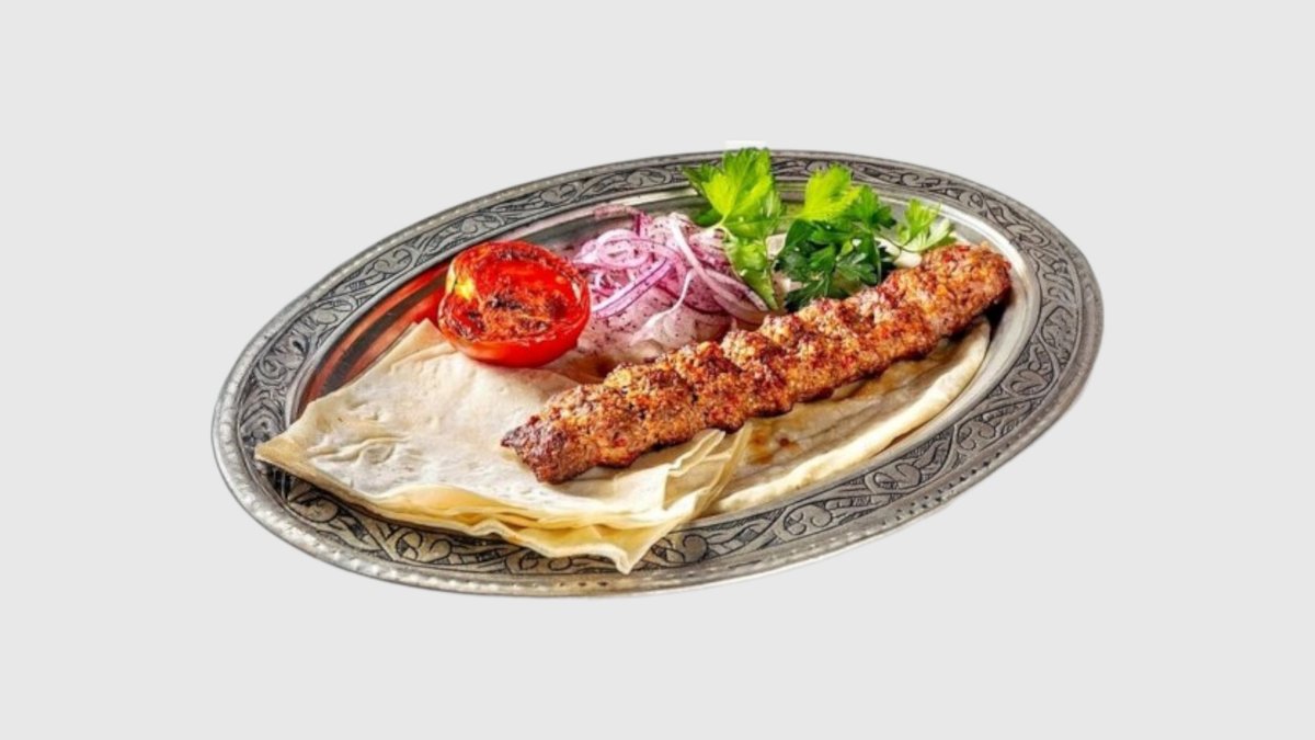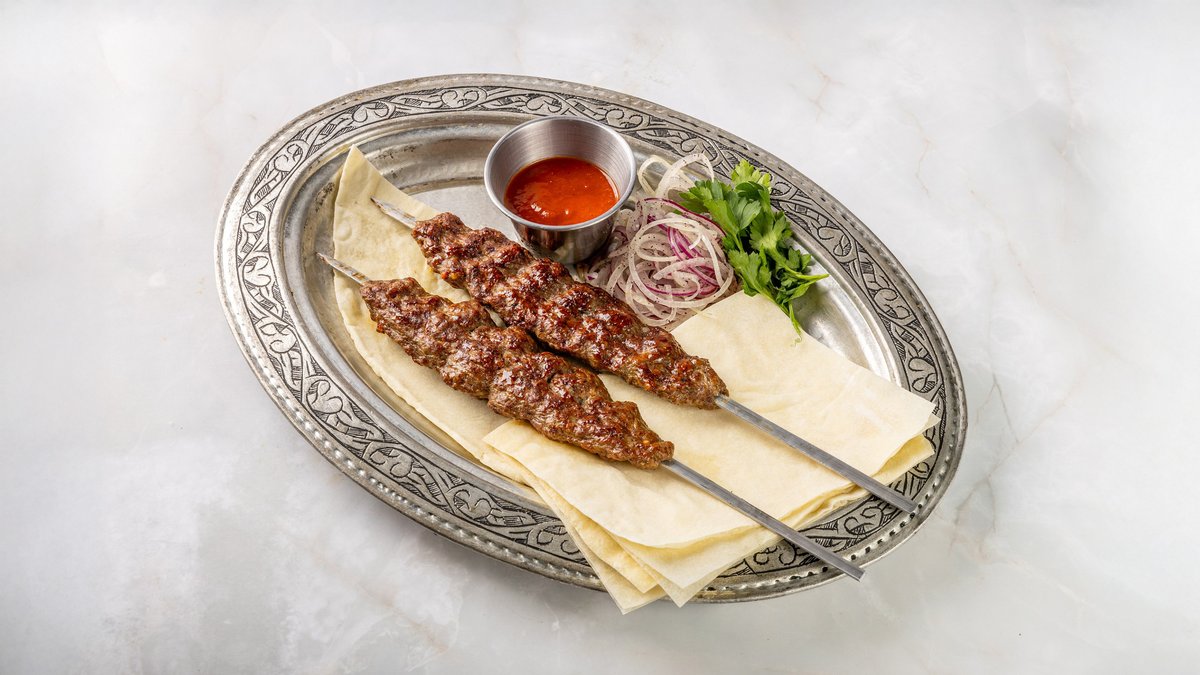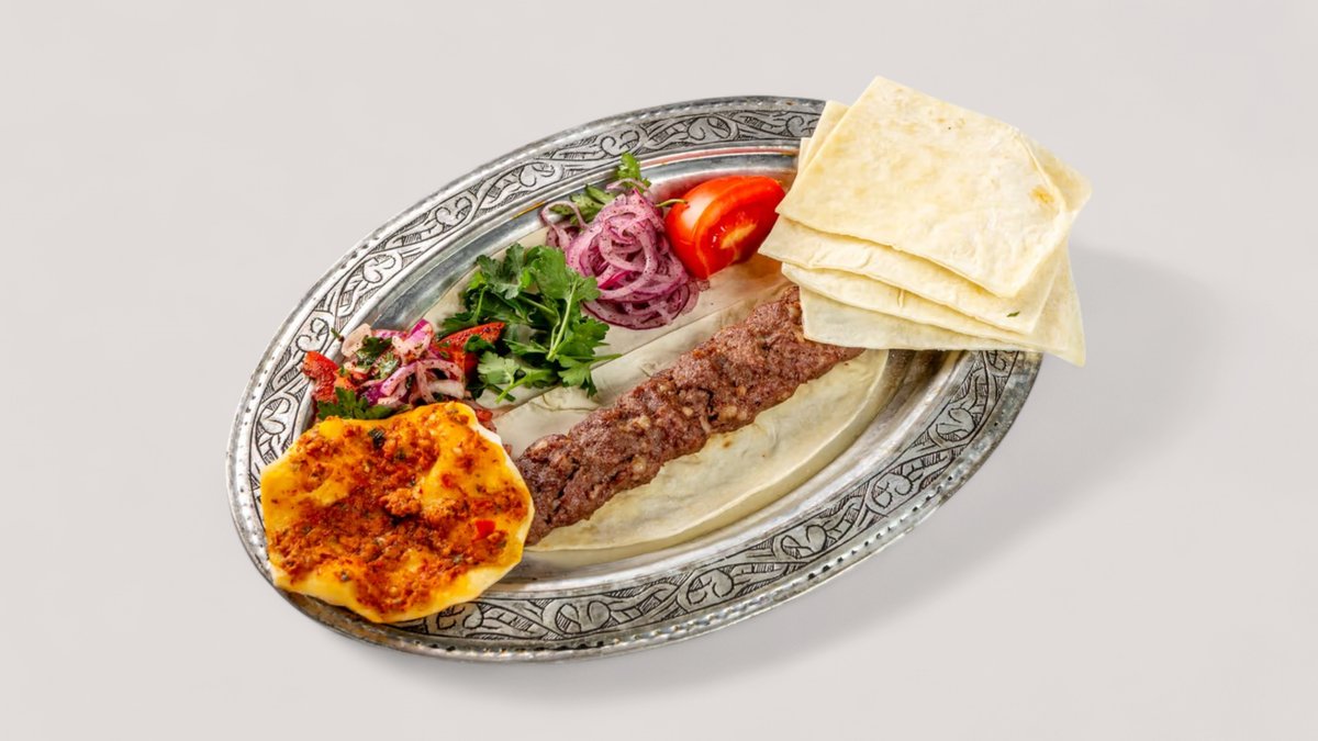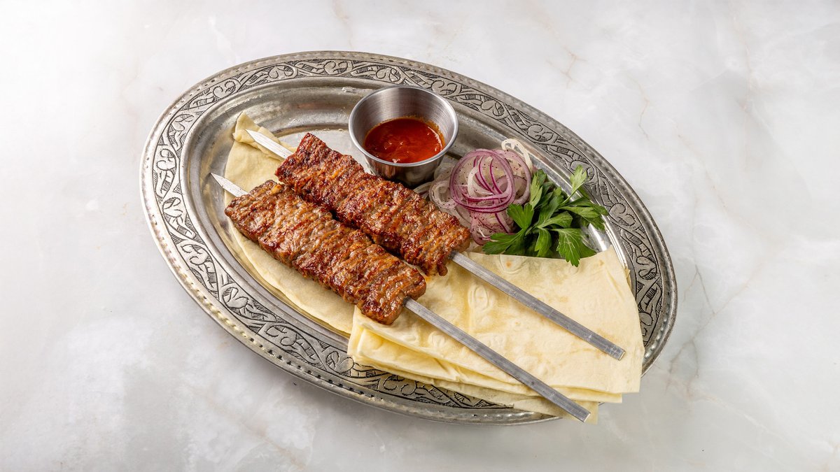 Адана кебаб завернутый в лаваш нарезается на части подается с йогуртом, зеленью и бейти(томатный) соусом