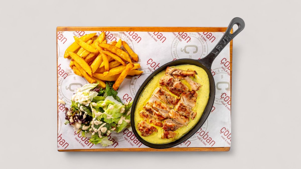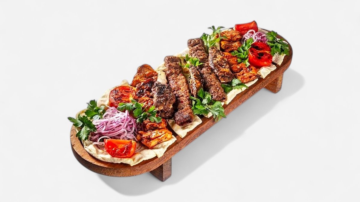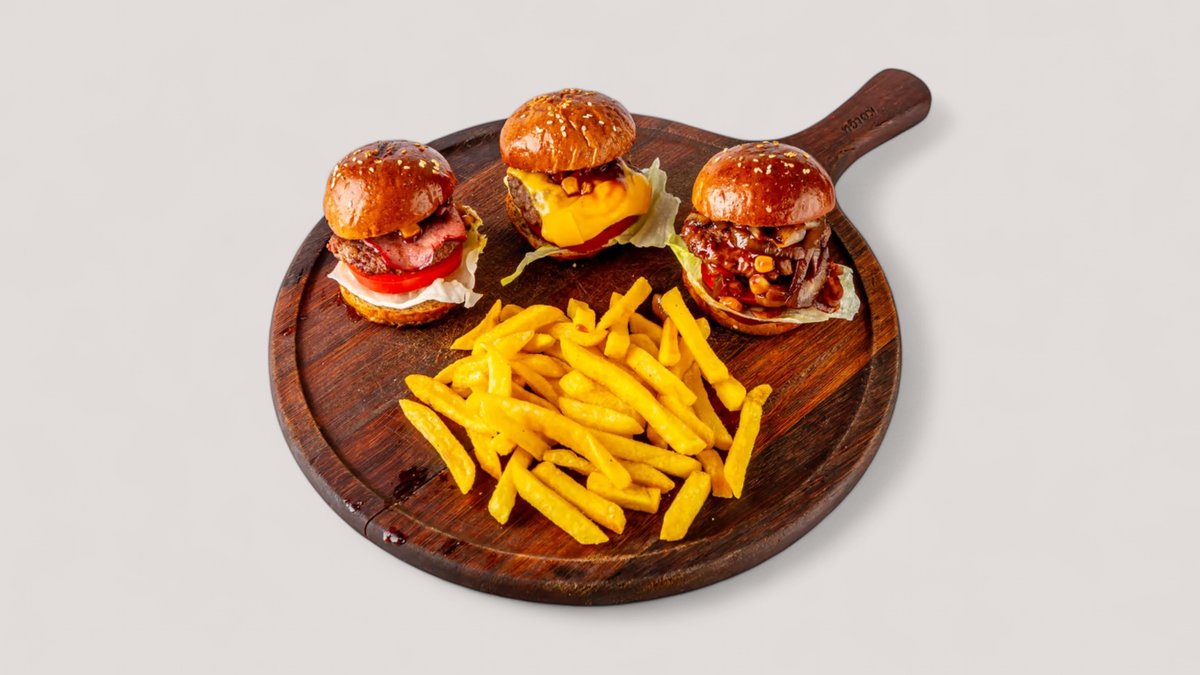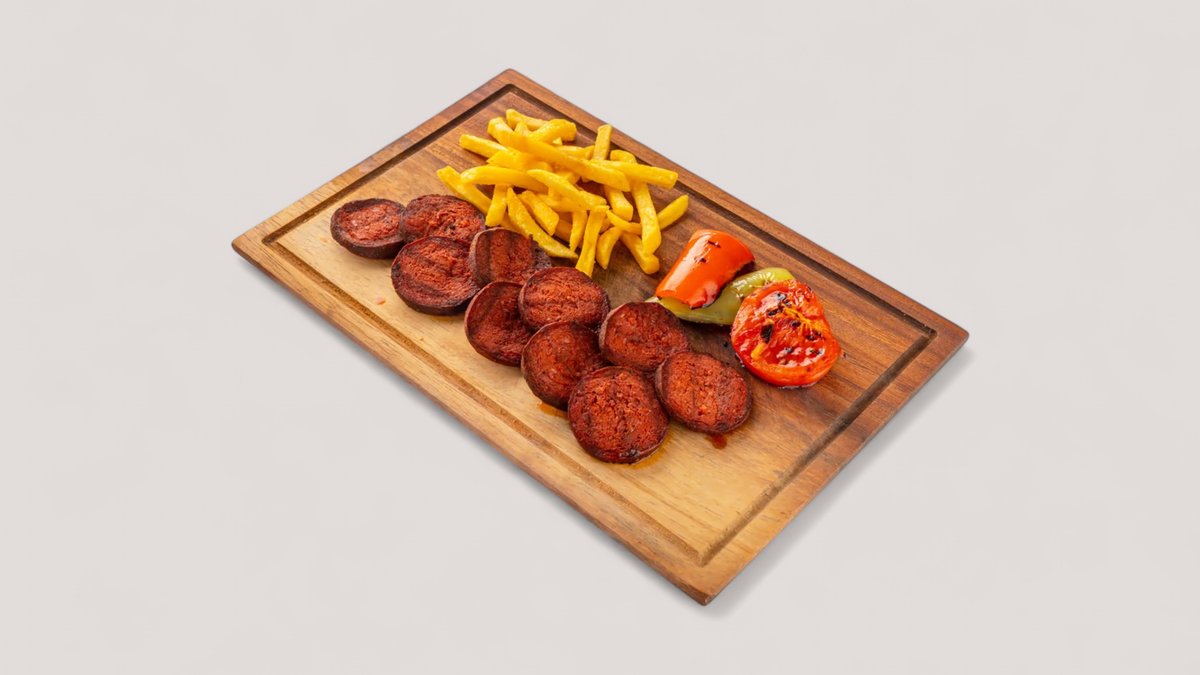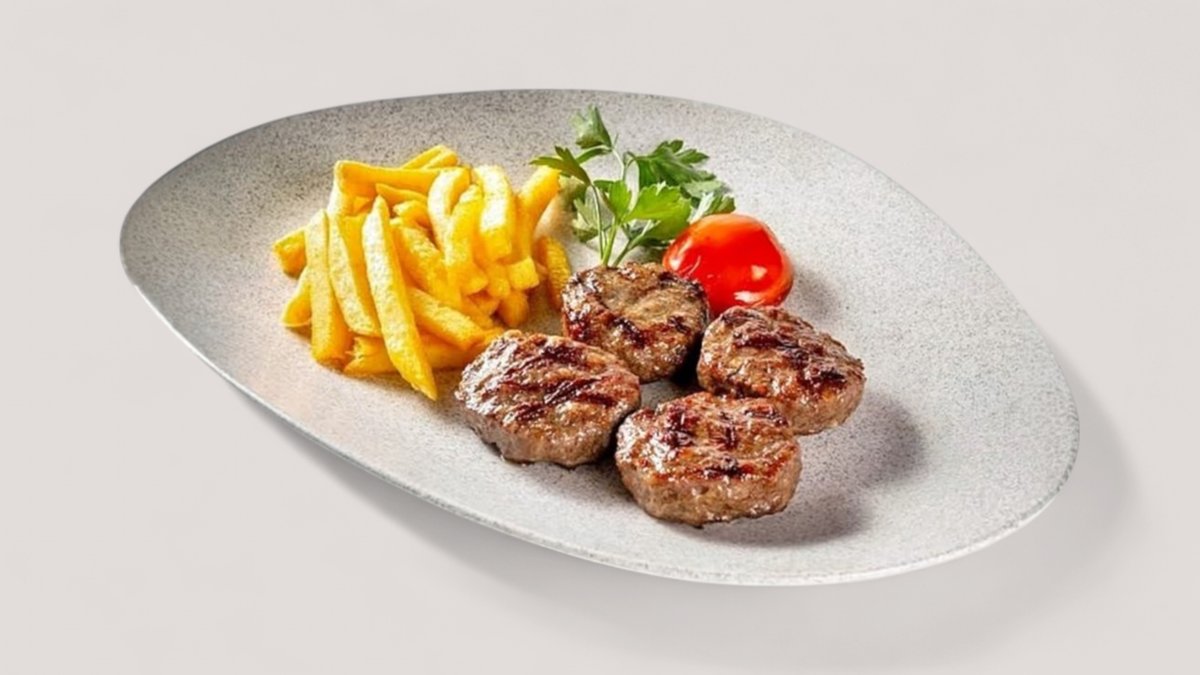 Котлеты из говяжьего фарша с добавлением репчатого лука, турецкой приправы для кефте и соли. Подается с картофелем фри, обжаренным томатом и веточкой петрушки