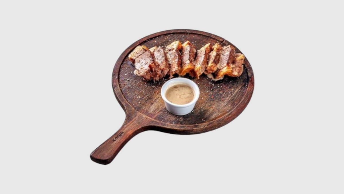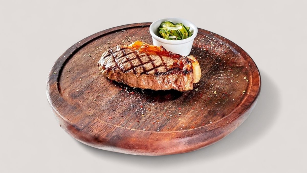 сочный рибай- стейк из конины, приготовленный на гриле. Отличается насыщенным вкусом и нежной текстурой. Подается с салатом