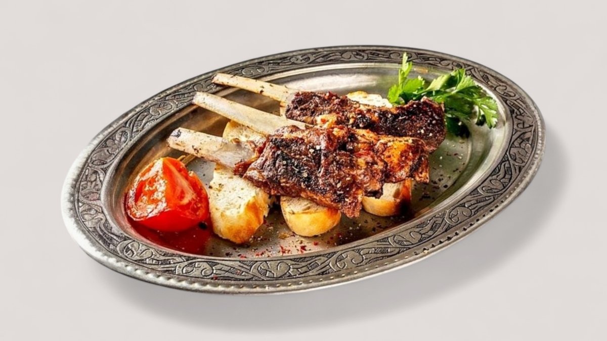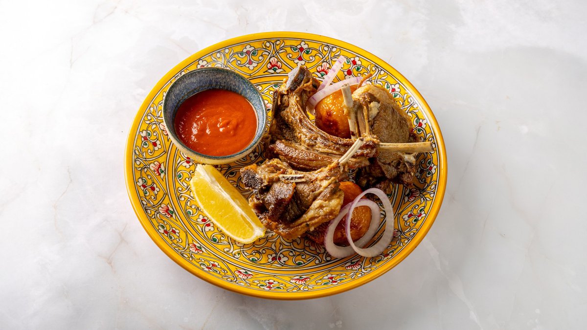 Бараньи ребрышки маринуются специях. Подаются с шпинатом с грибами и запечённым молодым картофелем.