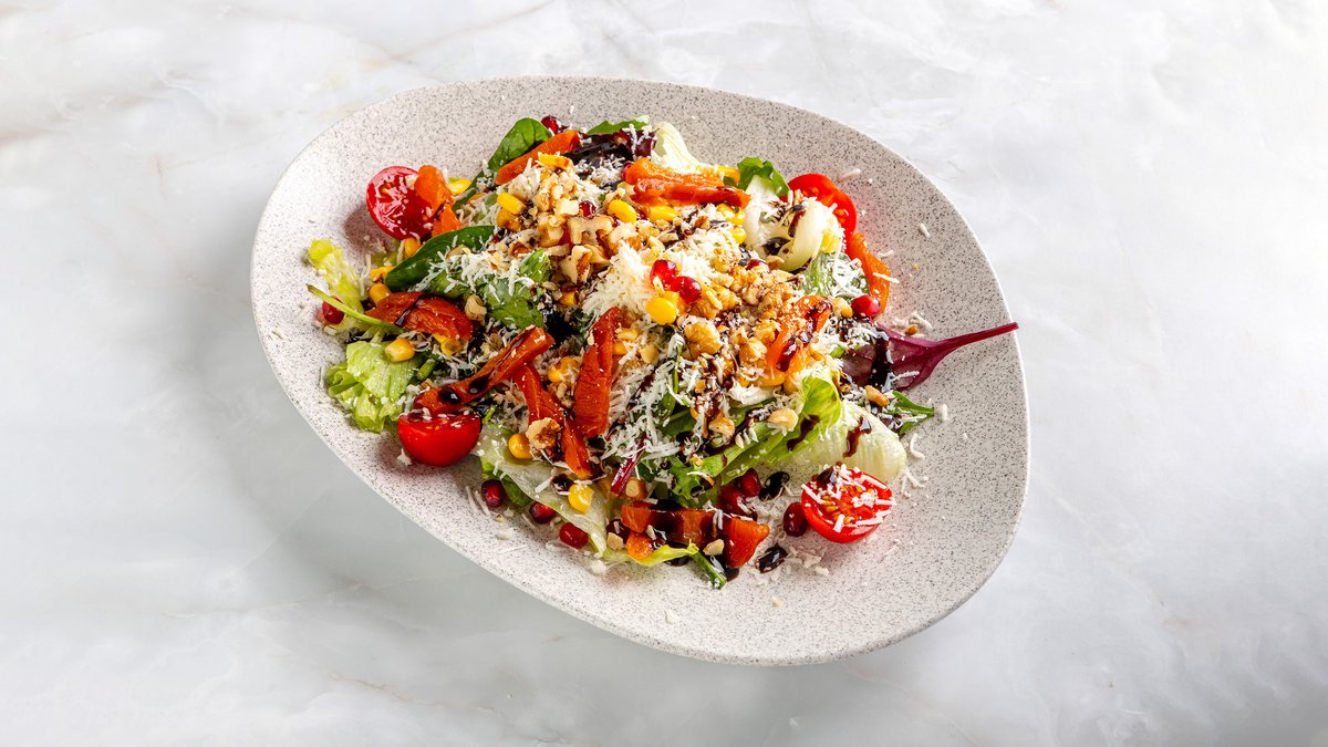 микс айсберга т свежей зелени; черри томаты; кукуруза; брынза; грецкие орехи; абрикос и гранат; заправленные оливковым маслом и гранатовым соусом