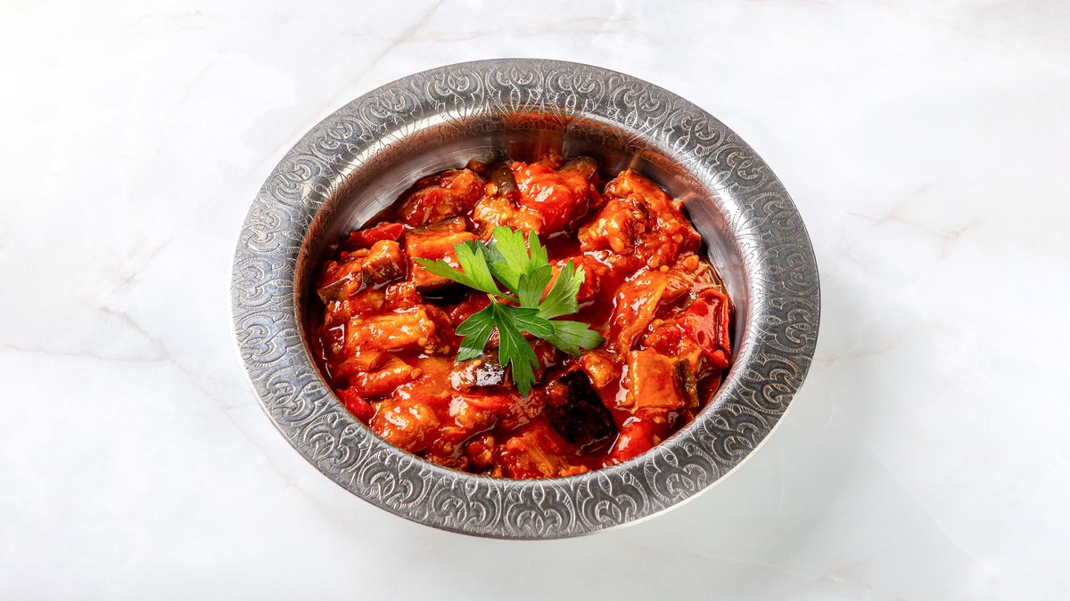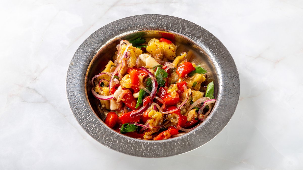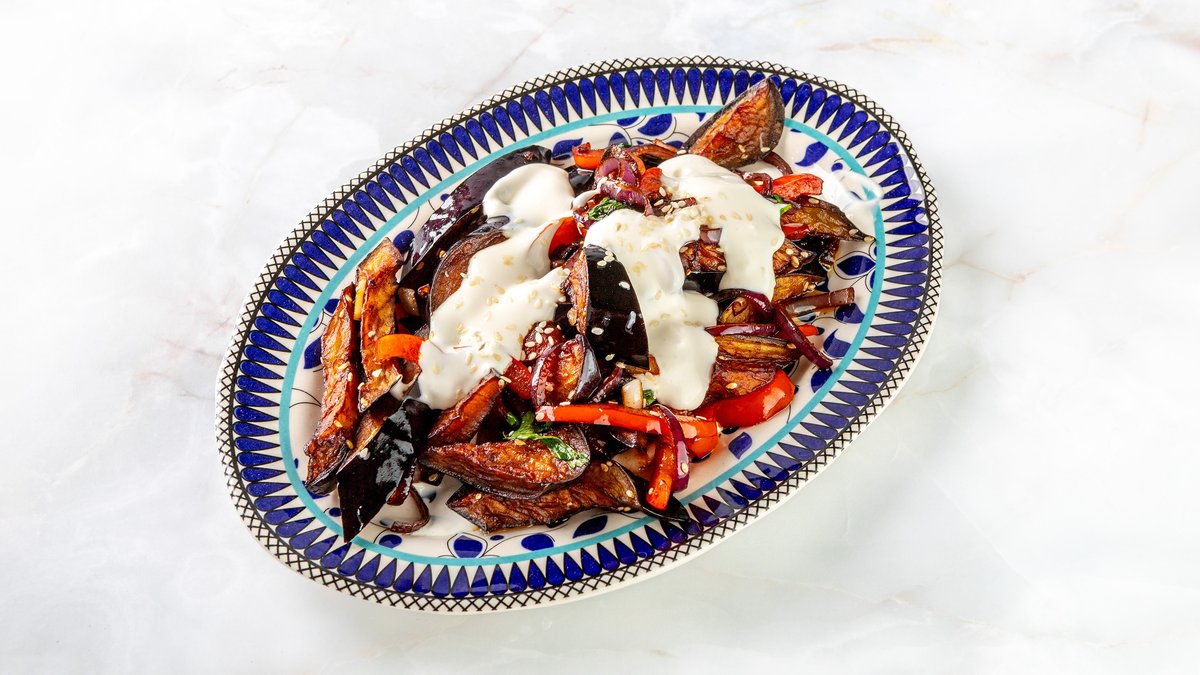 баклажаны с красным перцом, чесноком, петрушкой и кунжутом, заправленные оливковым маслом, соусом сайо и специями. подается с нежным турецким йогуртом
