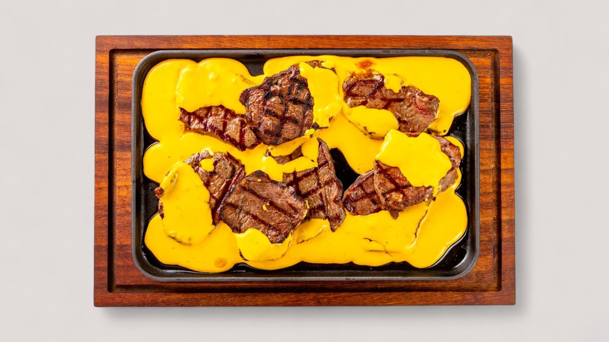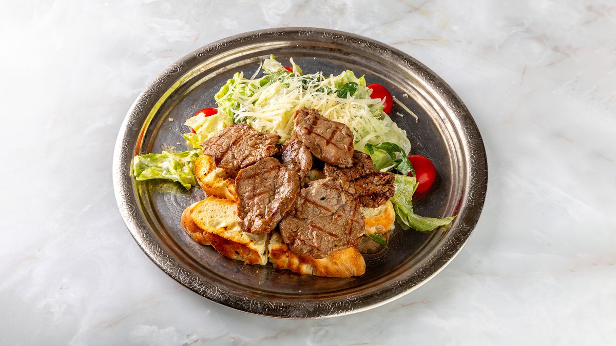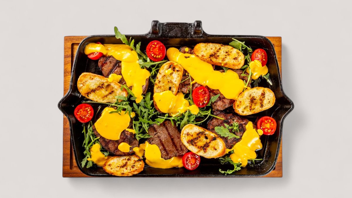 сочные куски стейка, свежие овощи, хрустящий багет и расплавленный сыр чеддер. Сытно и очень аппетитно