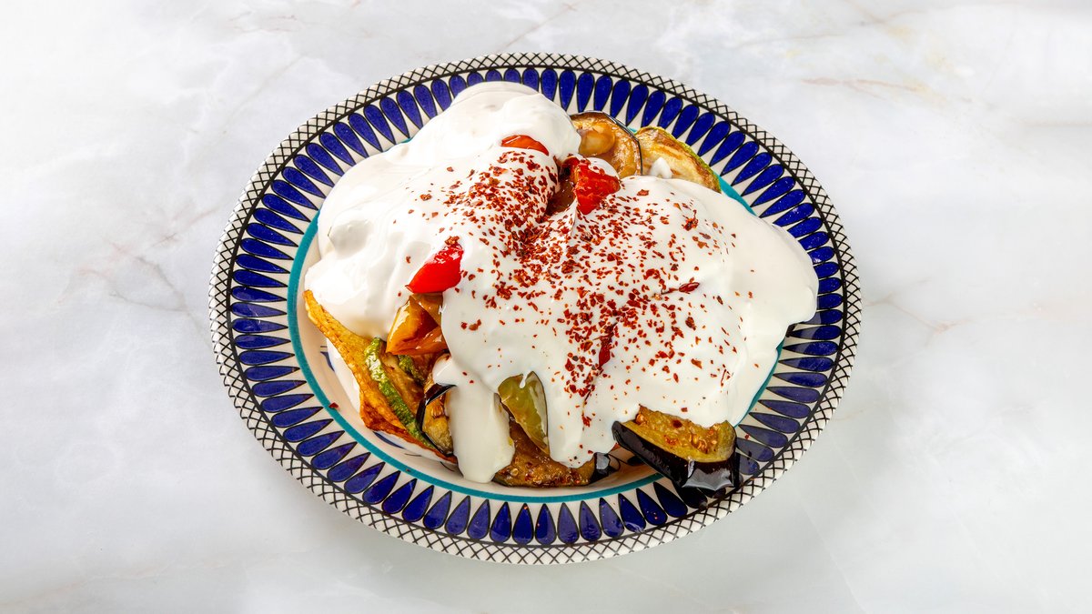 картофель, баклажан, красный и зеленый перцы, кабачок, заправленные нежным турецким йогуртом