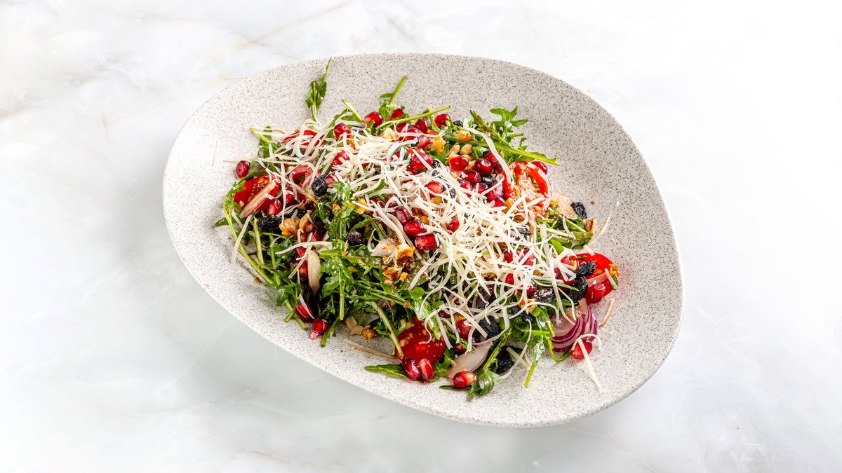 Руккола, черри томаты, красный лук, грецкие орехи, изюм и гранат, заправленные оливковым маслом и бальзамическим соусом, с пармезаном