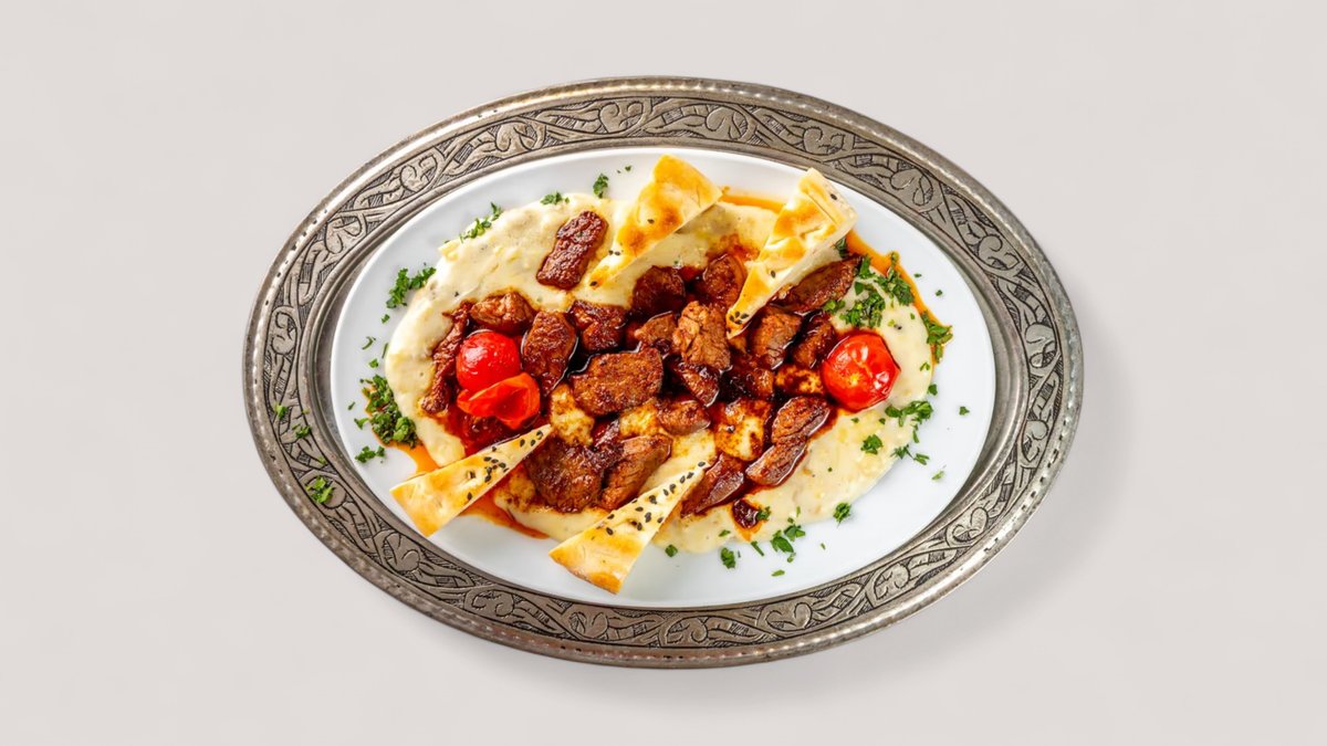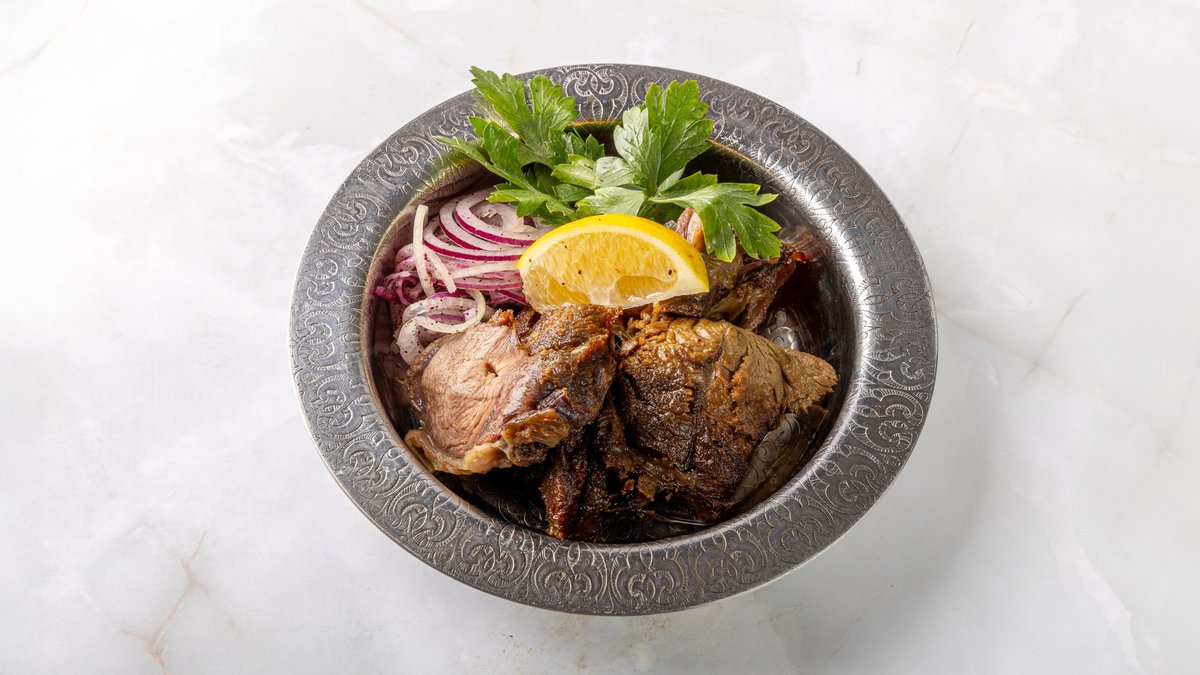 нут, кунжутная паста, чеснок, тмин, подается с оливковым маслом и копченой говядины