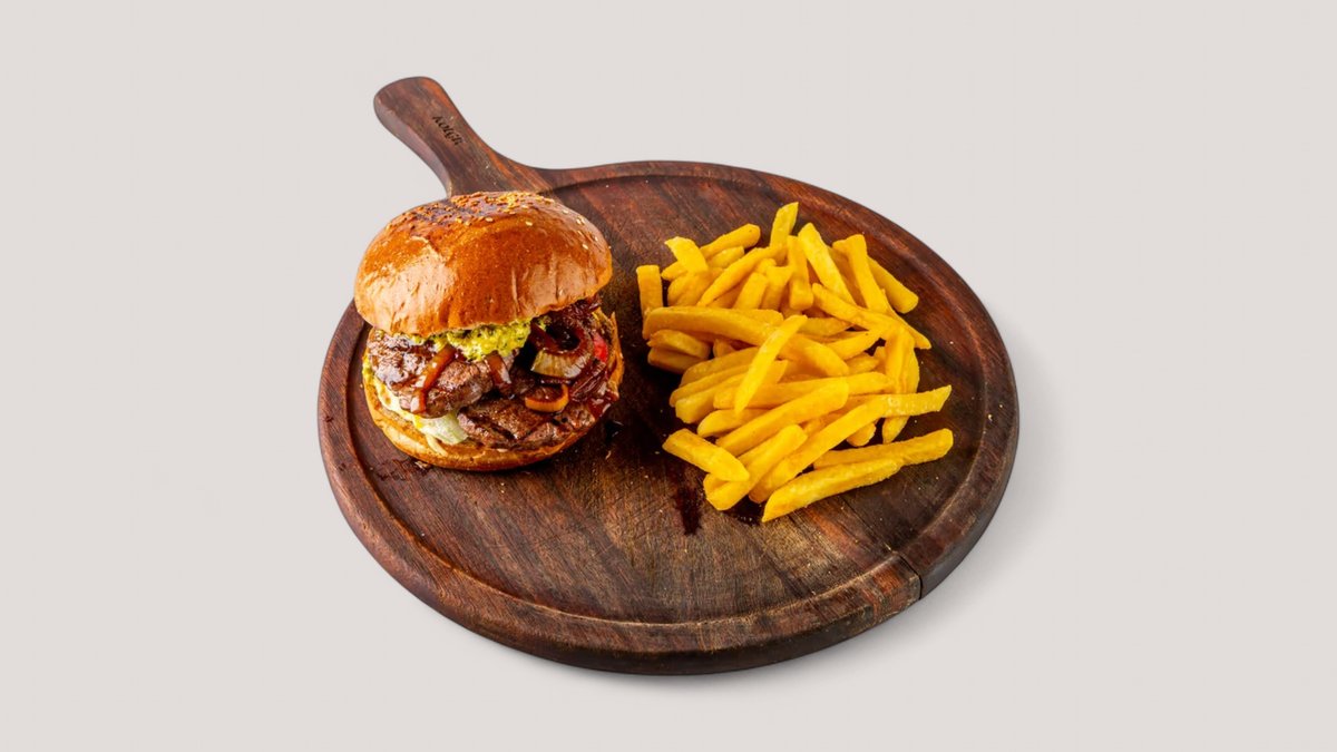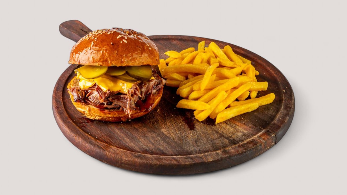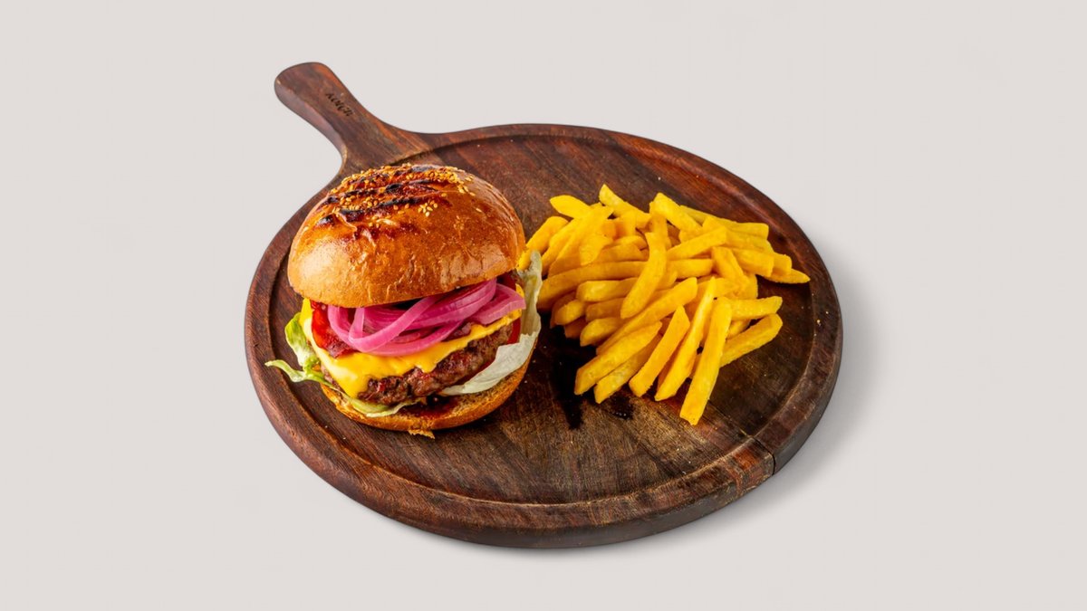 Бургер с говяжьей котлетой и копченым мясом, дополненный сыром чеддер, маринованным краным луком, свежим томатом и айсбергом. Подается с фирменным релиш-соусом на основе BBQ, корнишонов, паприки и кукурузы