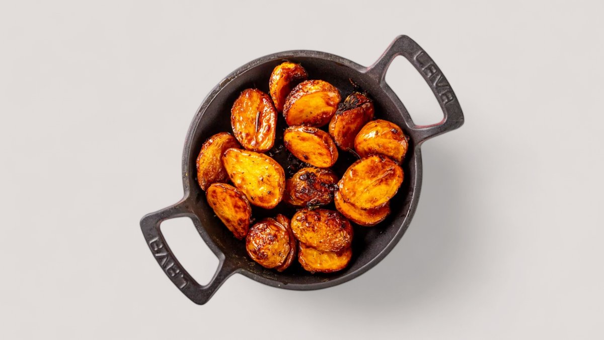 Бейби картофель обжаривается на подсолнечном масле с добавлением репчатого лука, тимьяна, розмарина и специй