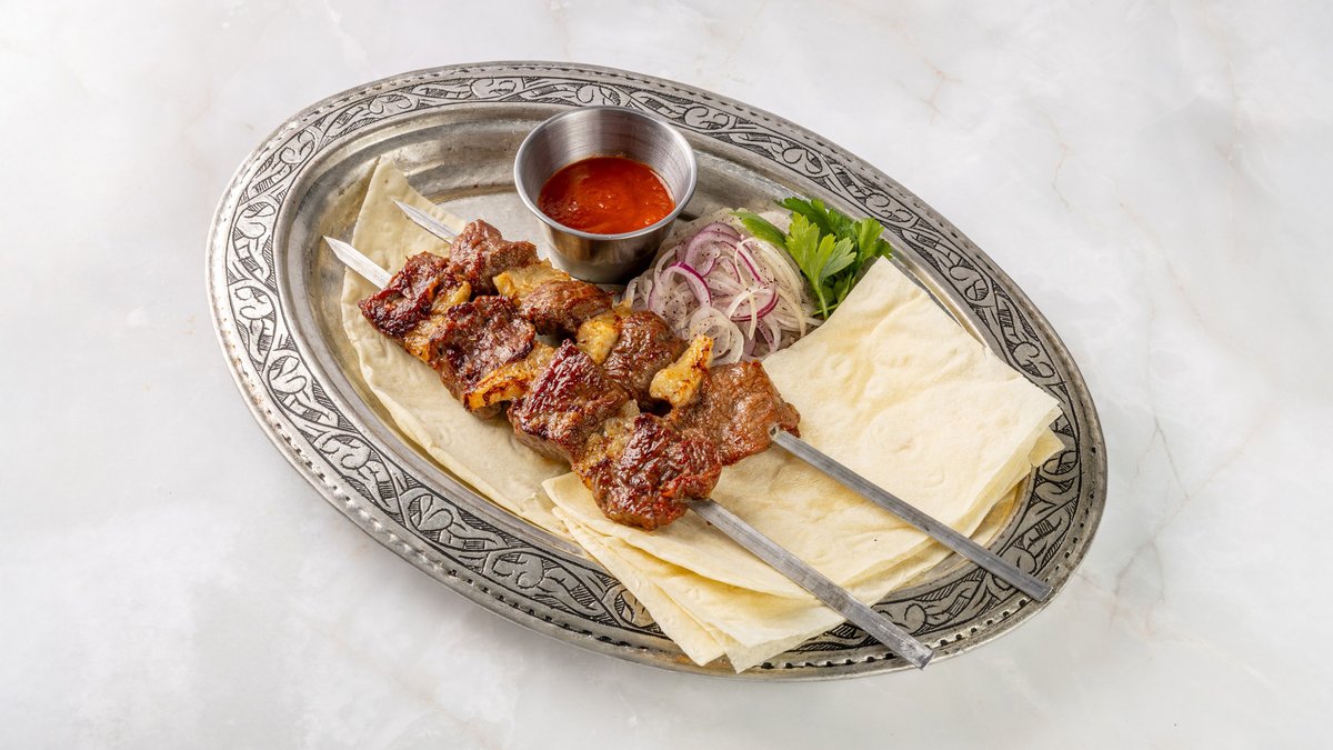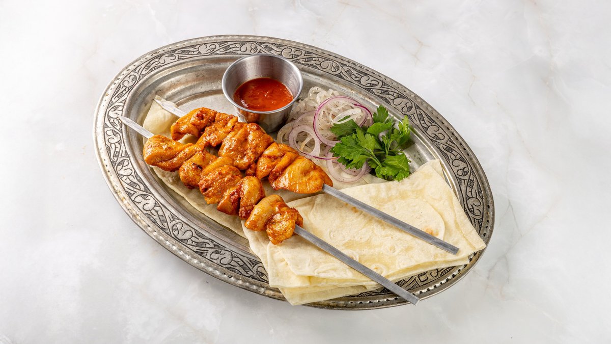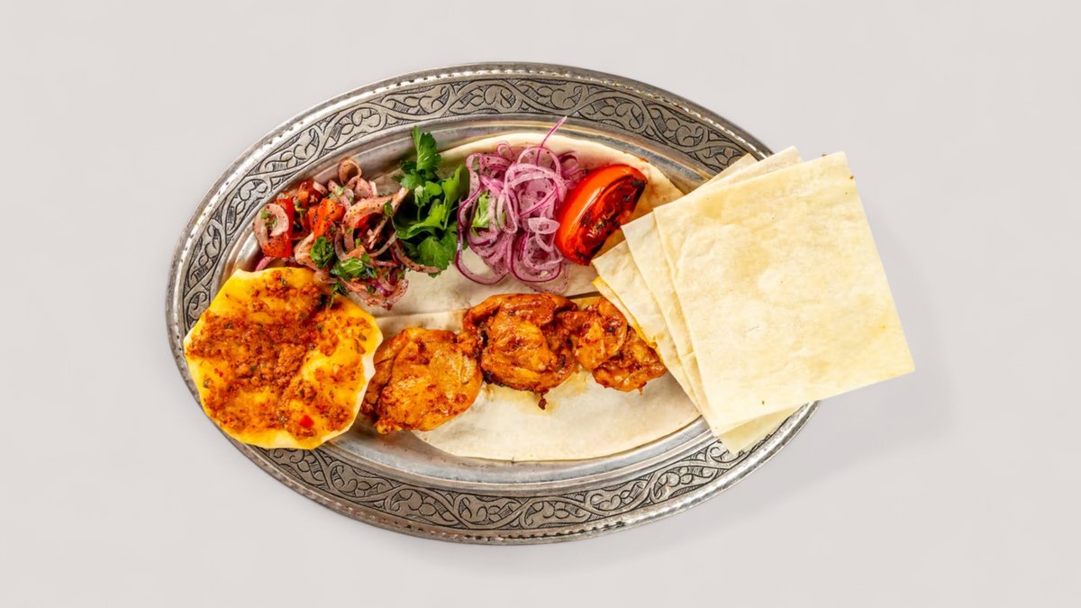 Куриное бедро без кости, маринованное в специях (карри, тмин, красный молотый перец и соус из острого перца) готовится на мангале выкладывается на лаваш и декорируется томатами в сочетании с маринованным луком