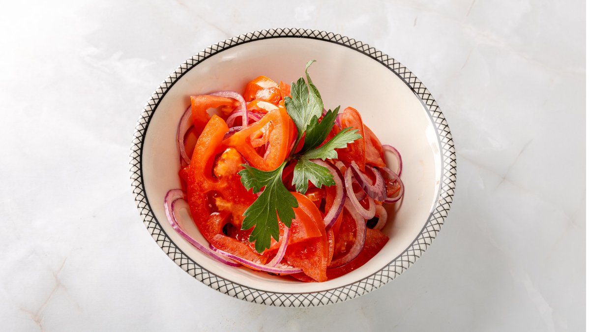 Томаты, репчатый лук, острый красный перец, горький перец нарезаются мелким кубиком и заправляются оливковым маслом в сочетании с гранатовым соусом. Посыпаются грецким орехом и украшаются веточкой петрушки перед подачей