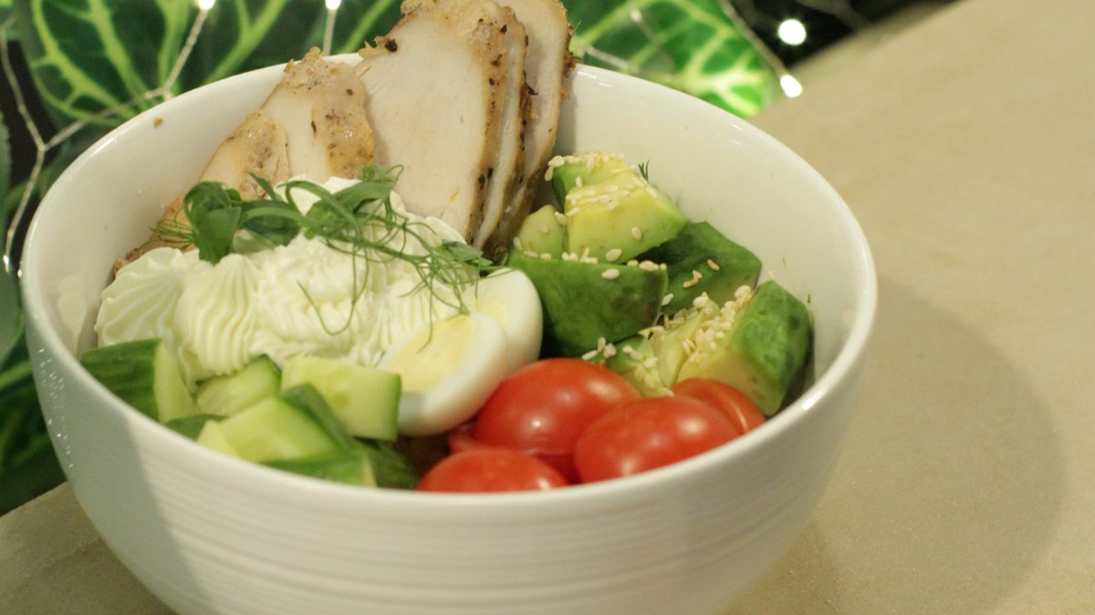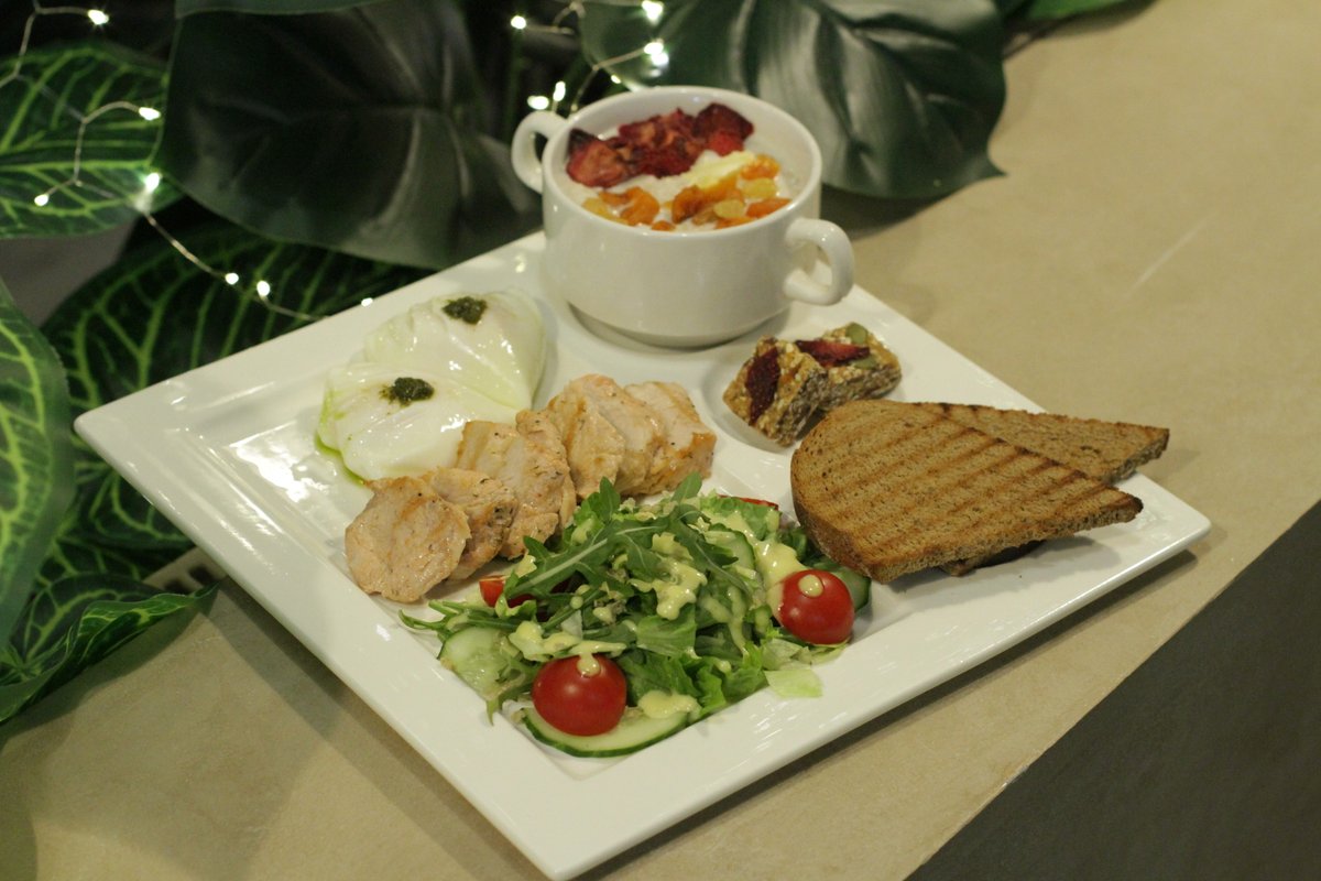Каша на выбор с добавками; яйца пашот; филе индейки; микс салата; апельсиновая заправка; фитнес-батончик; тост; сливочно-сырное масло;