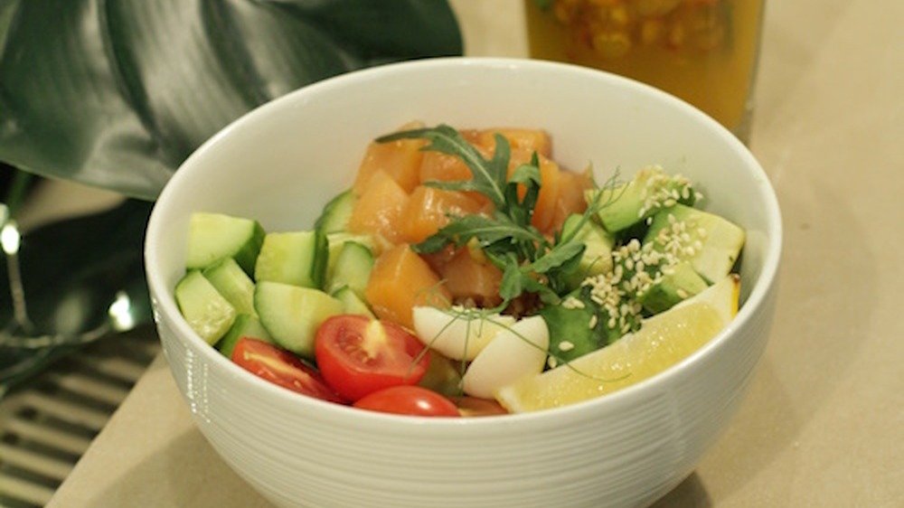 Круассан, малосольная семга, творожный сыр, яйцо пашот, черри, салат, песто