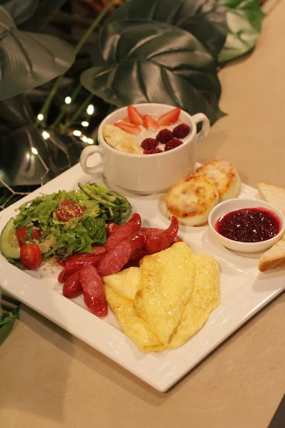 Каша на выбор с добавками; глазунья; копченая говядина; микс салата; блинчики; джем; тост; сливочно-сырное масло.