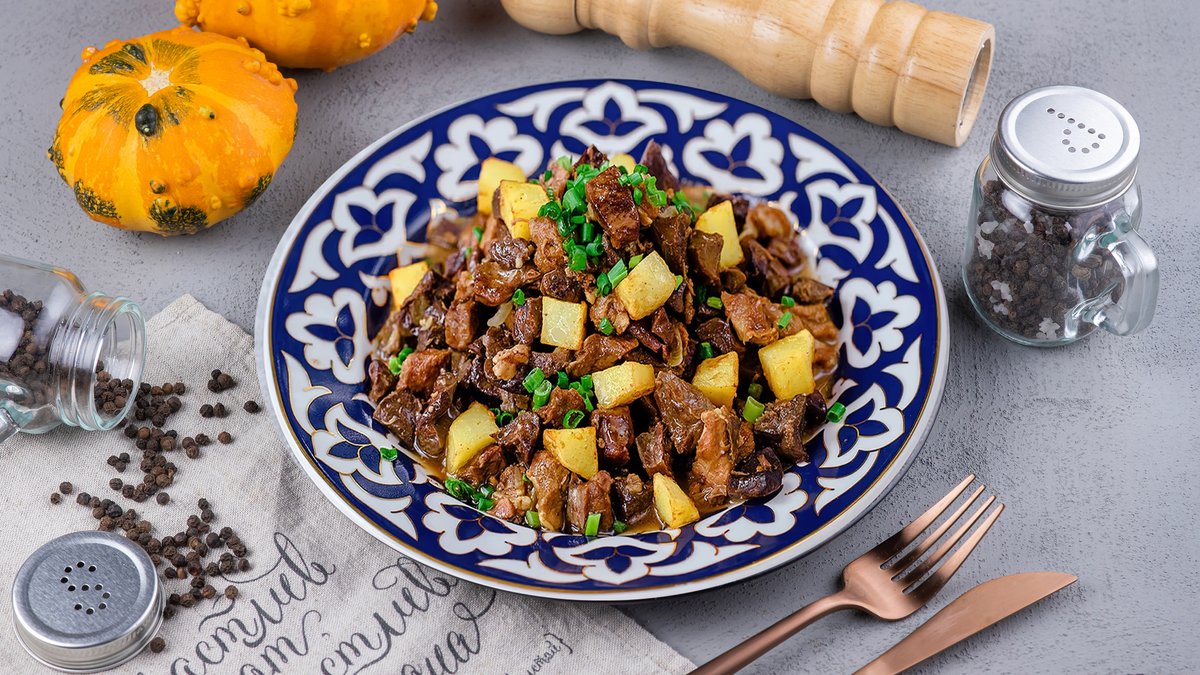Сердце , печень , легкое , мясо говядины, лук , картофель , специи